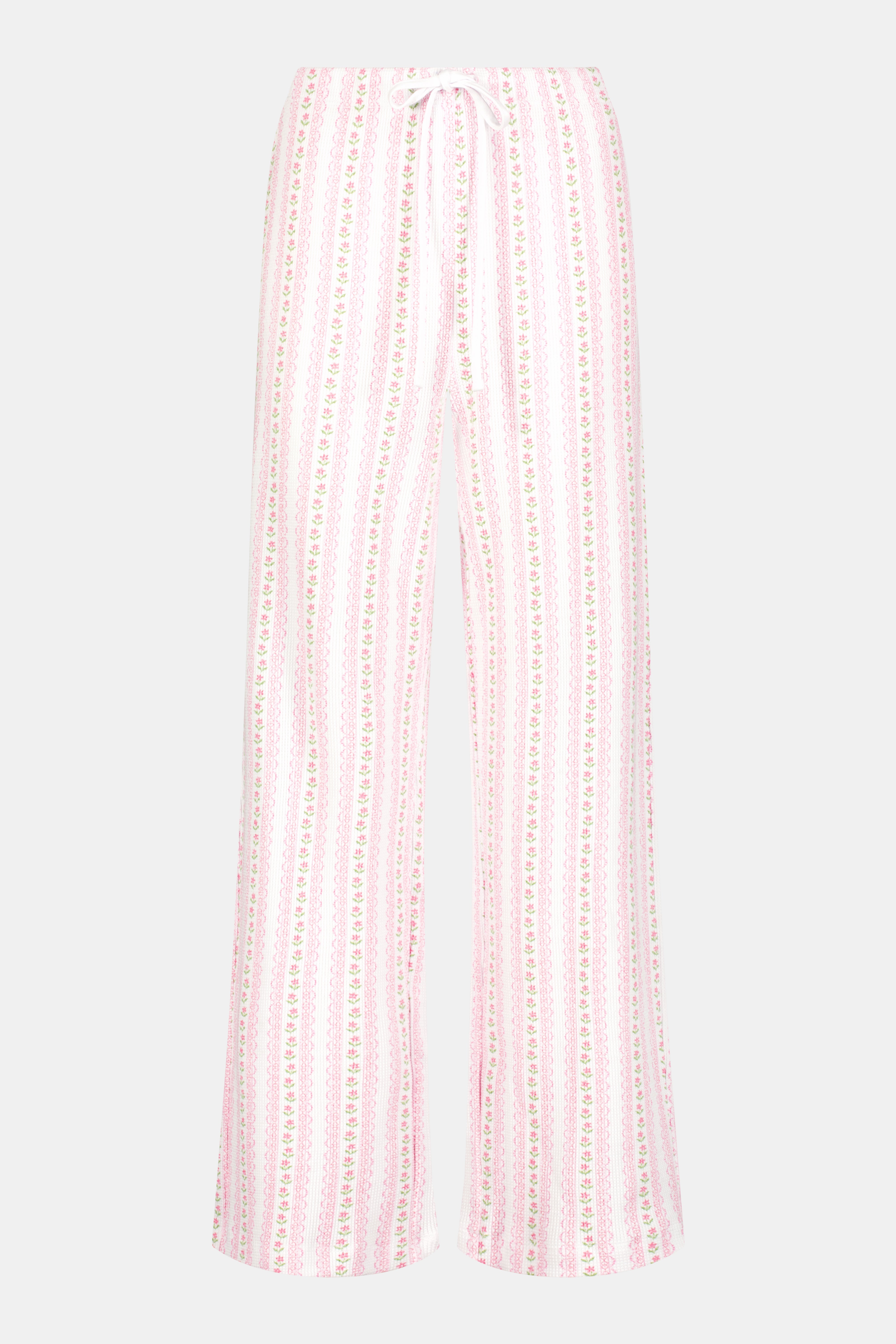 Treat yourself to cute comfort with the Julienne Pant, a high-rise, wide-legged Pima Waffle pant in a delicate pink Daisy Heart Stripe print.