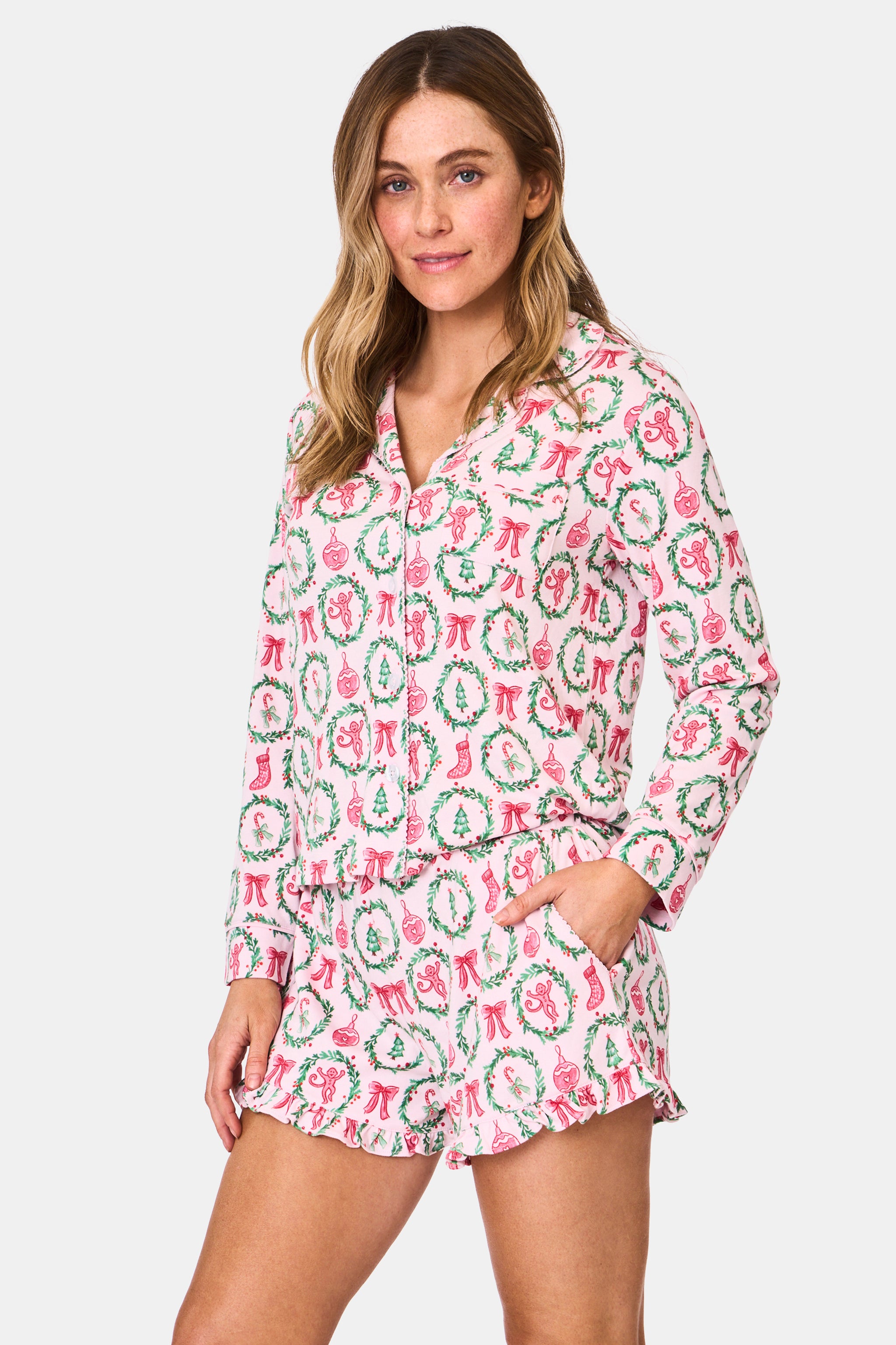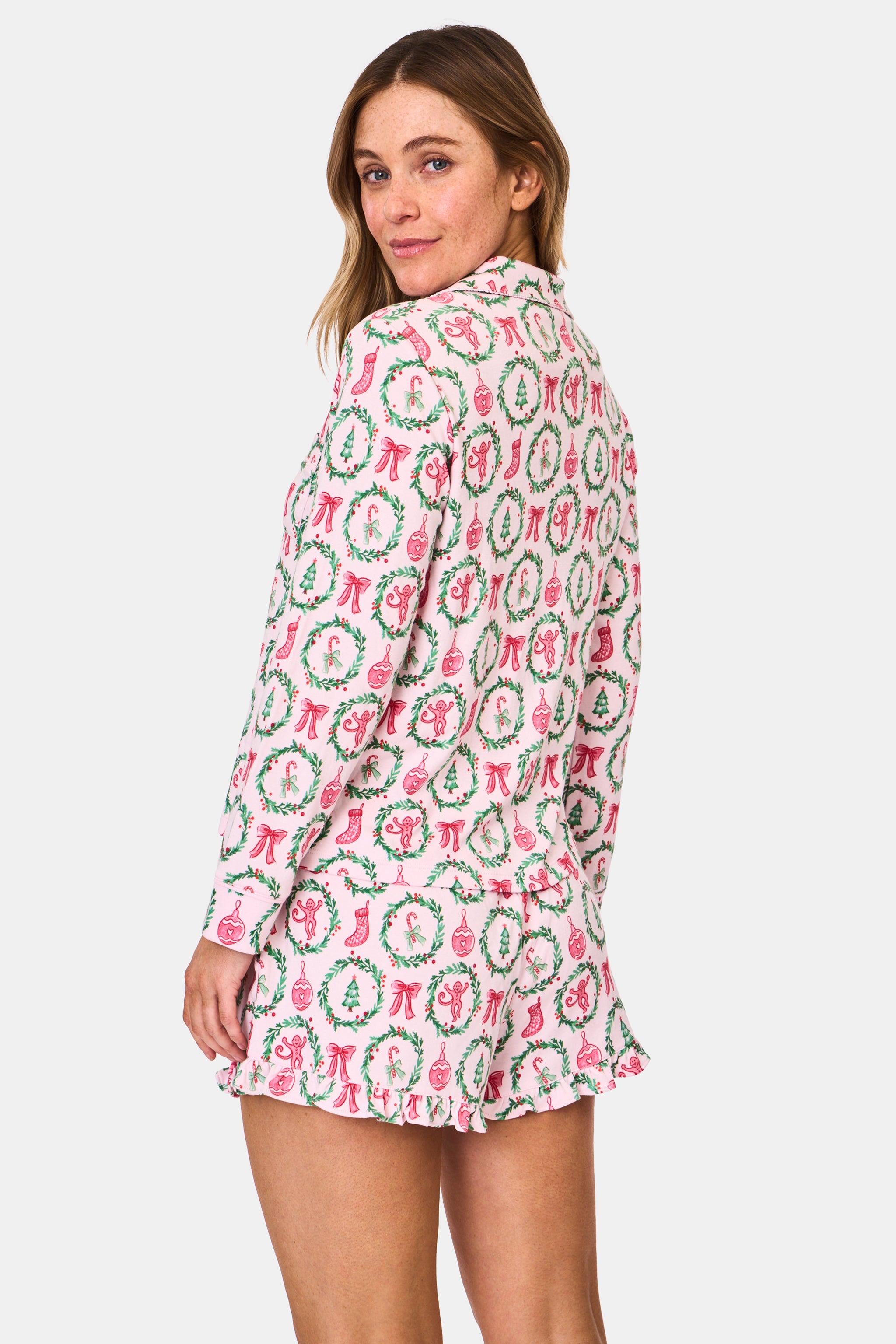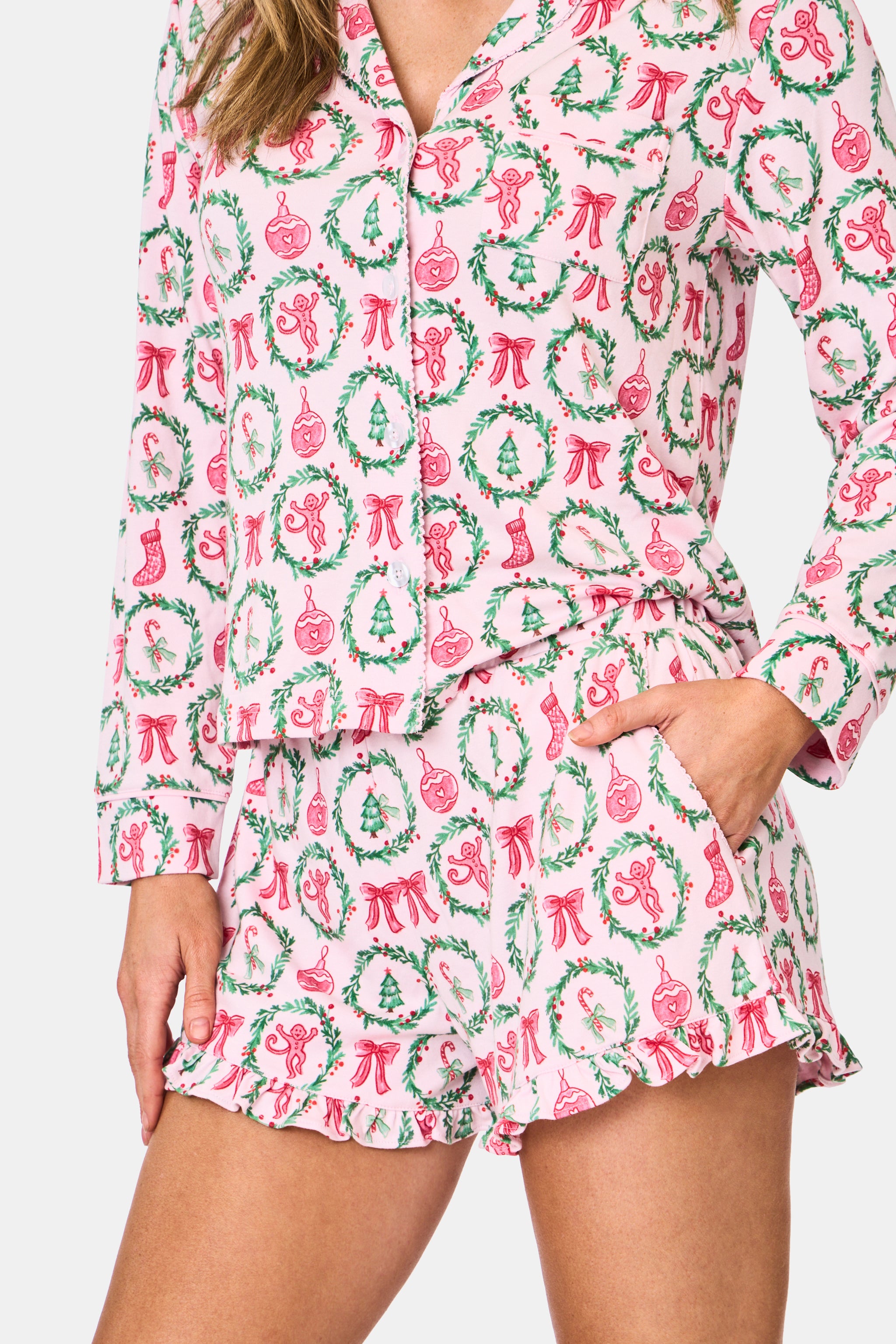 'Tis the season for our newest silhouette - the Hayden set! Get in the spirit with this cheerful and cheeky, festive pink and green print, the classic long sleeve polo top paired with the ruffled shorts are the perfect Winter-morning combo. Pair this set with some tube socks and you'll be set on the couch for all the holiday classics!