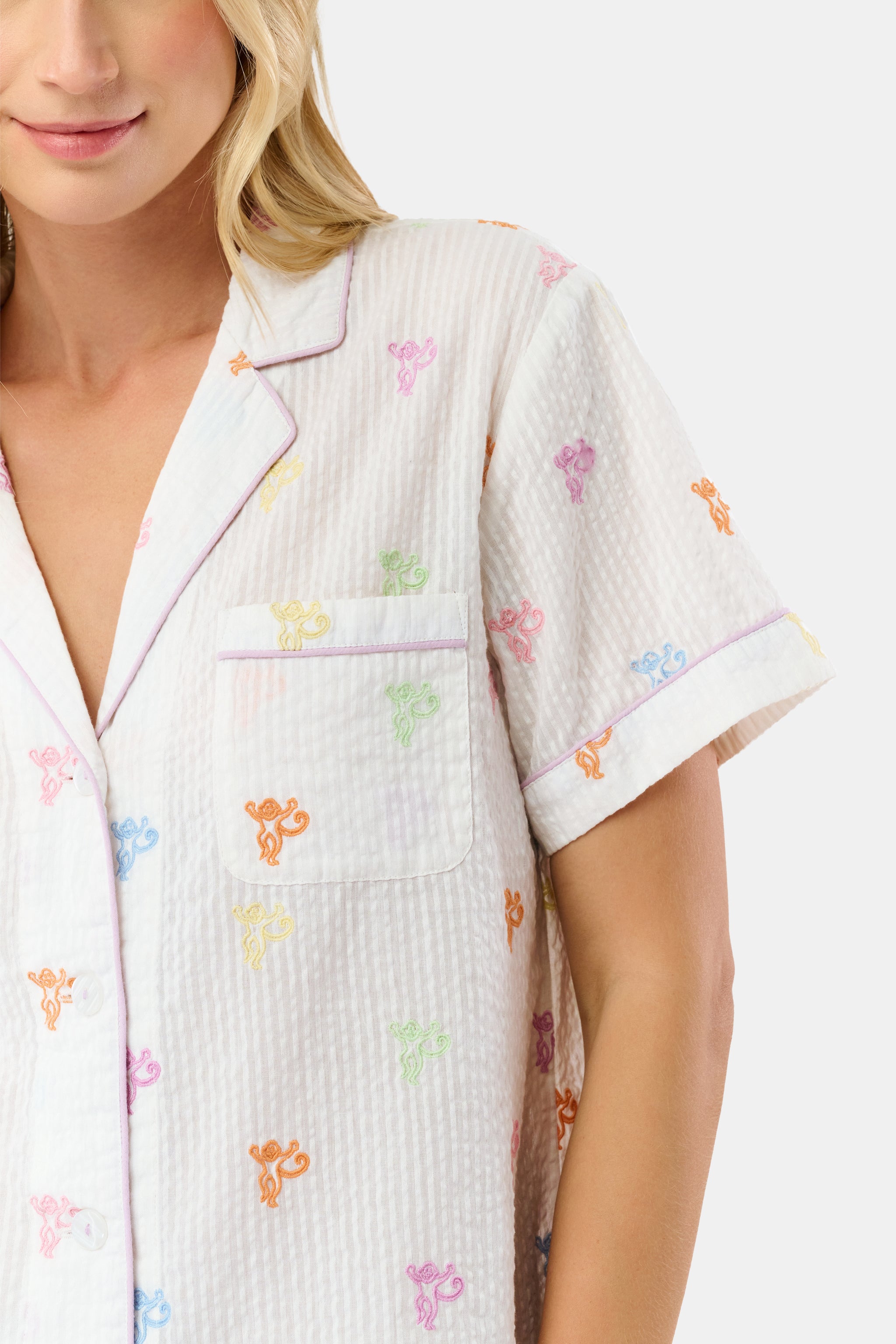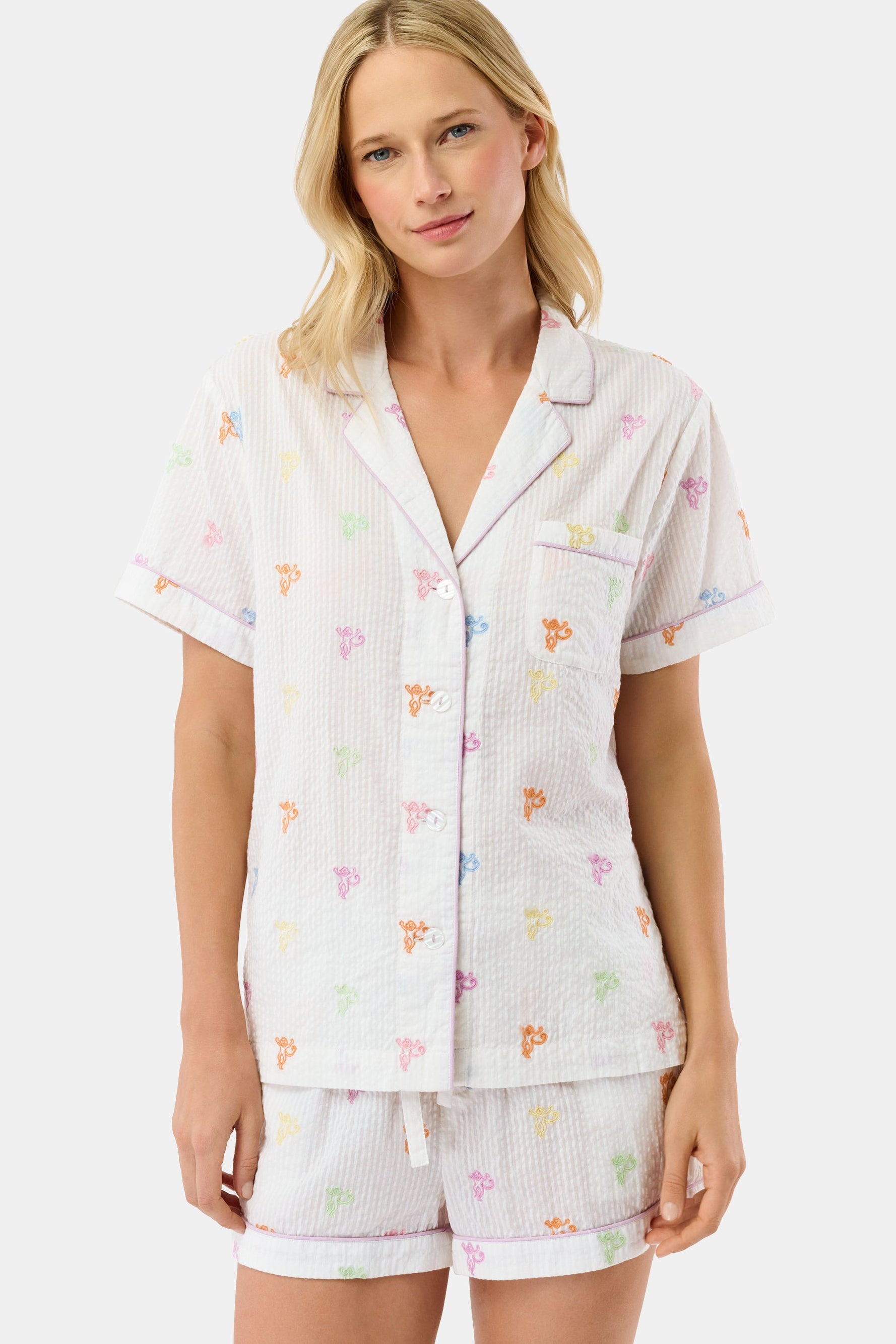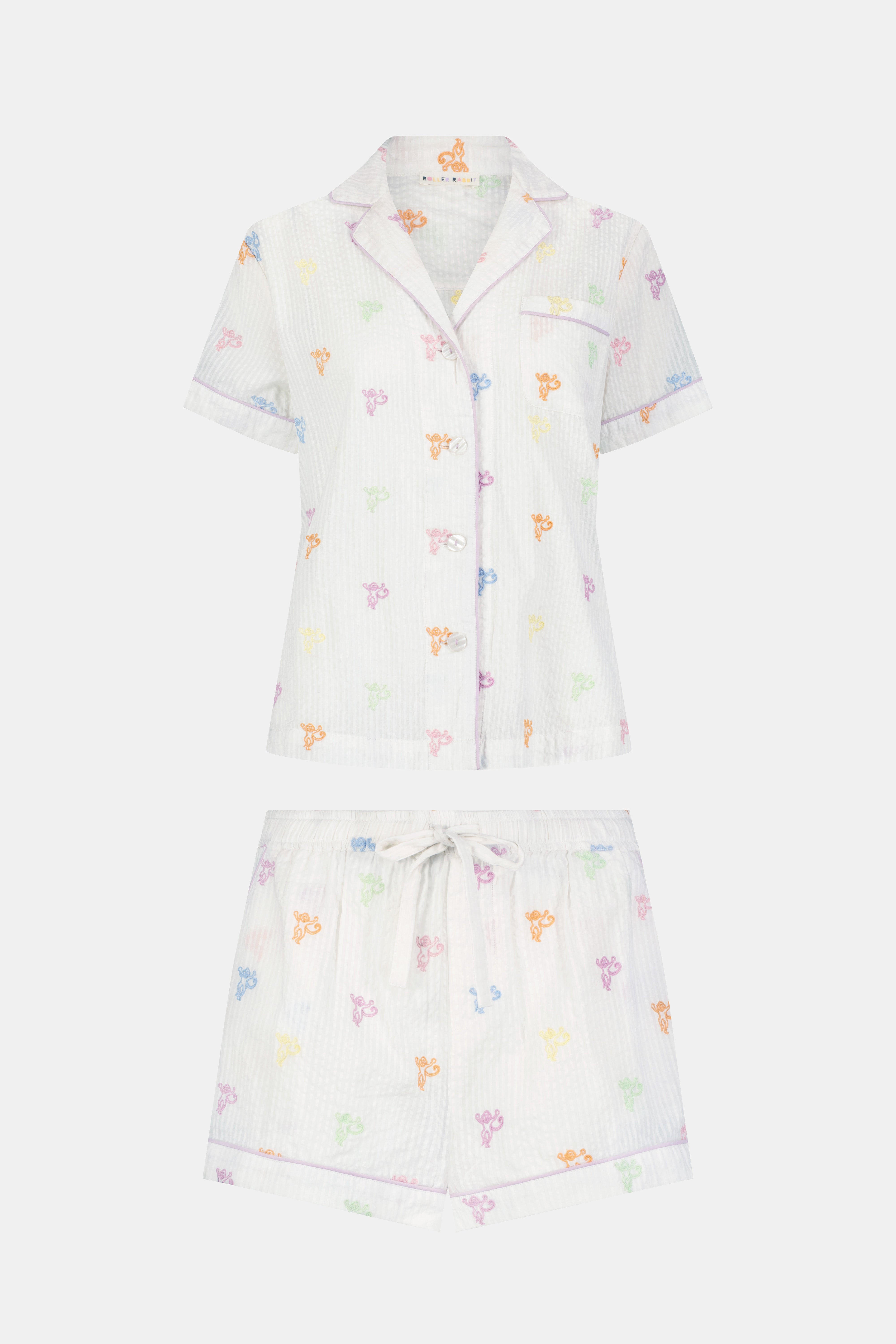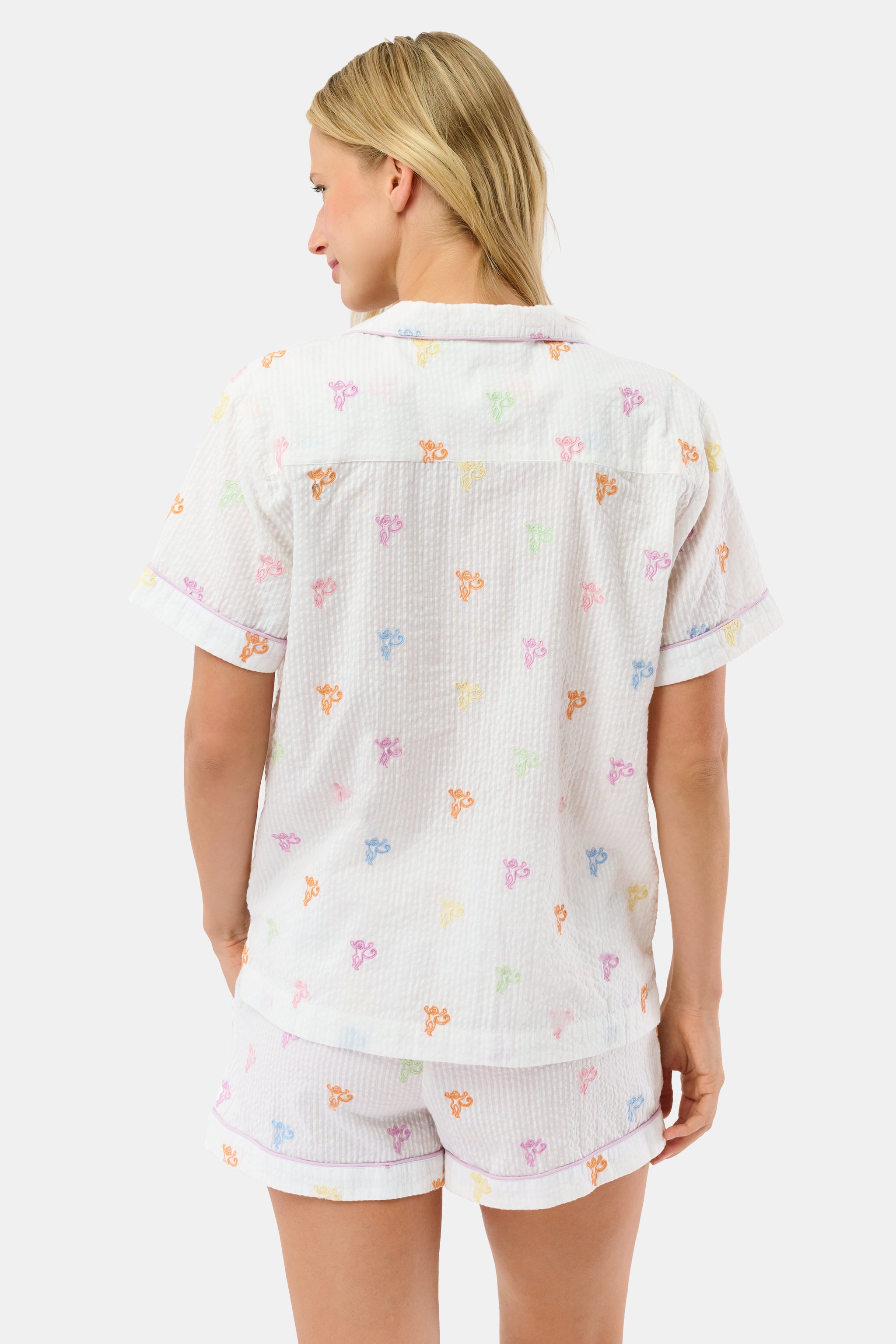 Delight is in the details. Our Livy Set is the sweetest white cotton seersucker top and shorts with adorable mini monkey embroidery scattered throughout both pieces—made for your most relaxed or most mischievous days!