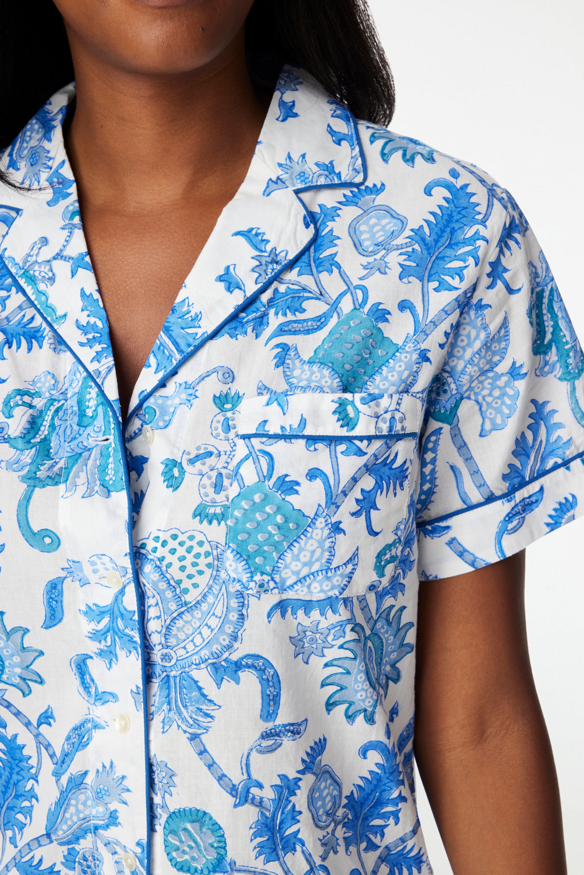 Laidback weekends and the Amanda Lulu Set go together like avocado and toast. This adorable cotton short set in a bright blue floral print includes shorts with split sides and a classic short-sleeve button-up top with a front pocket.