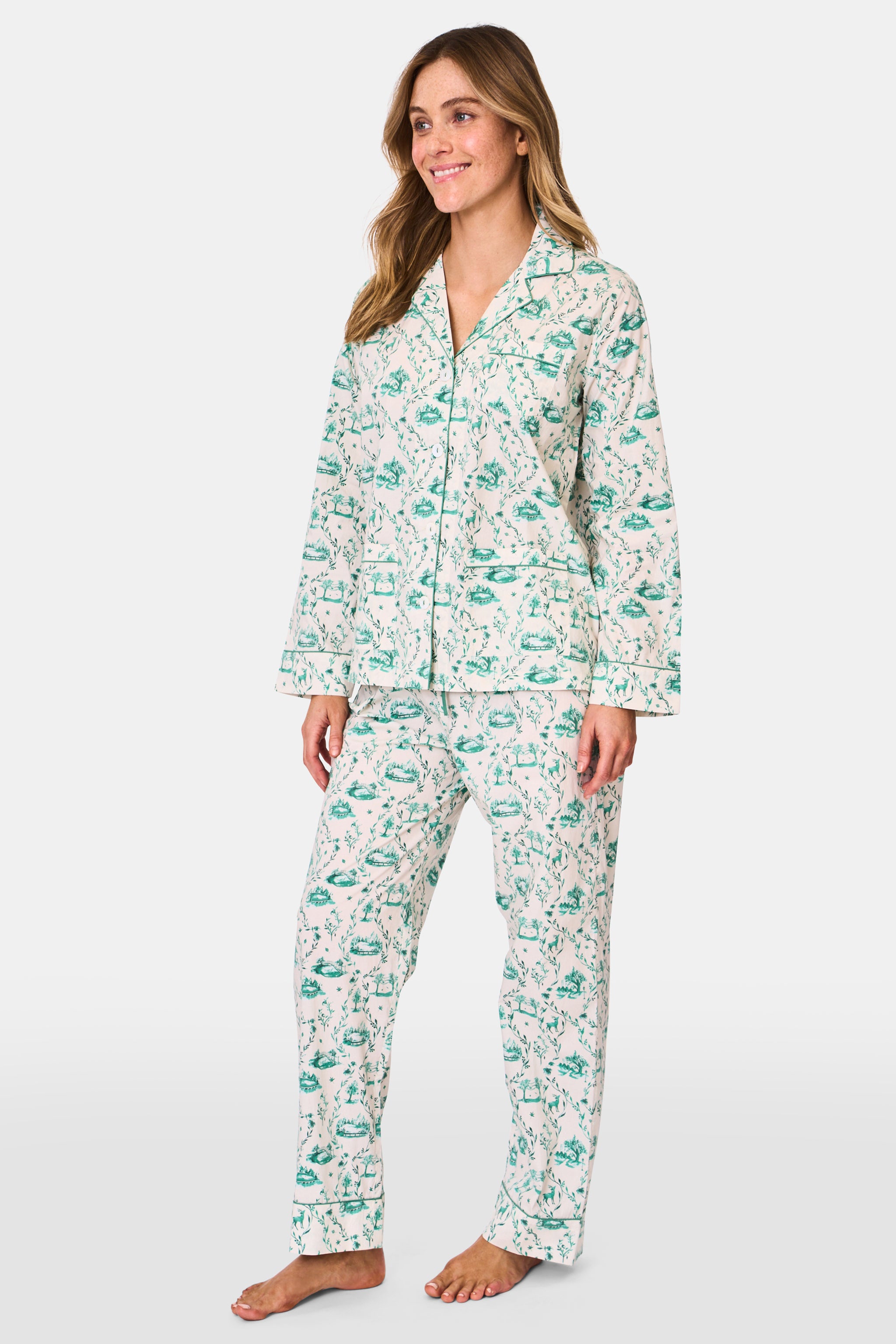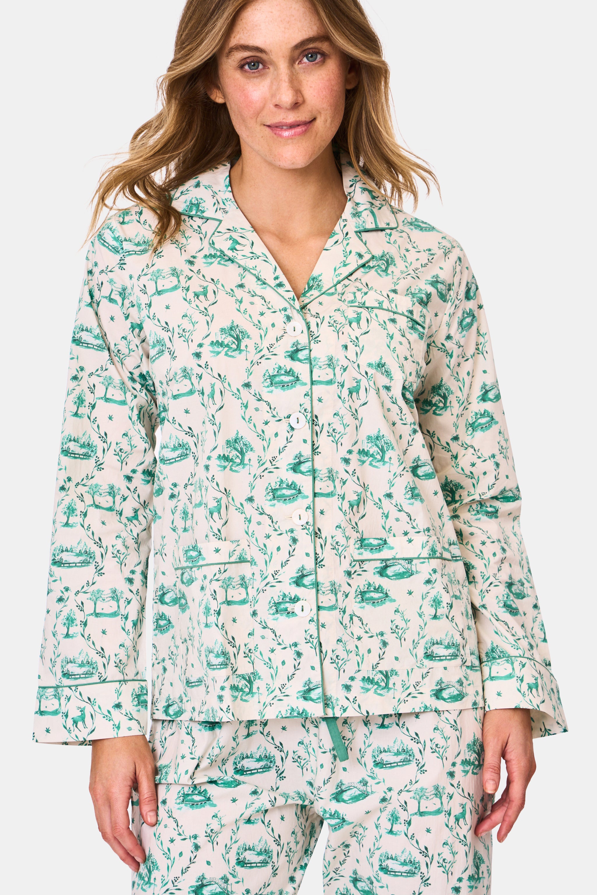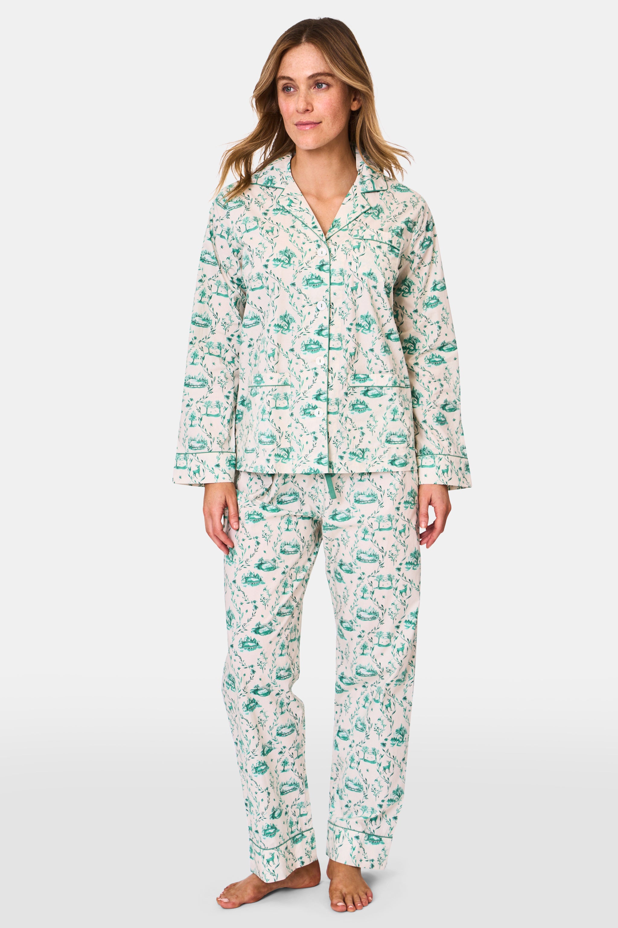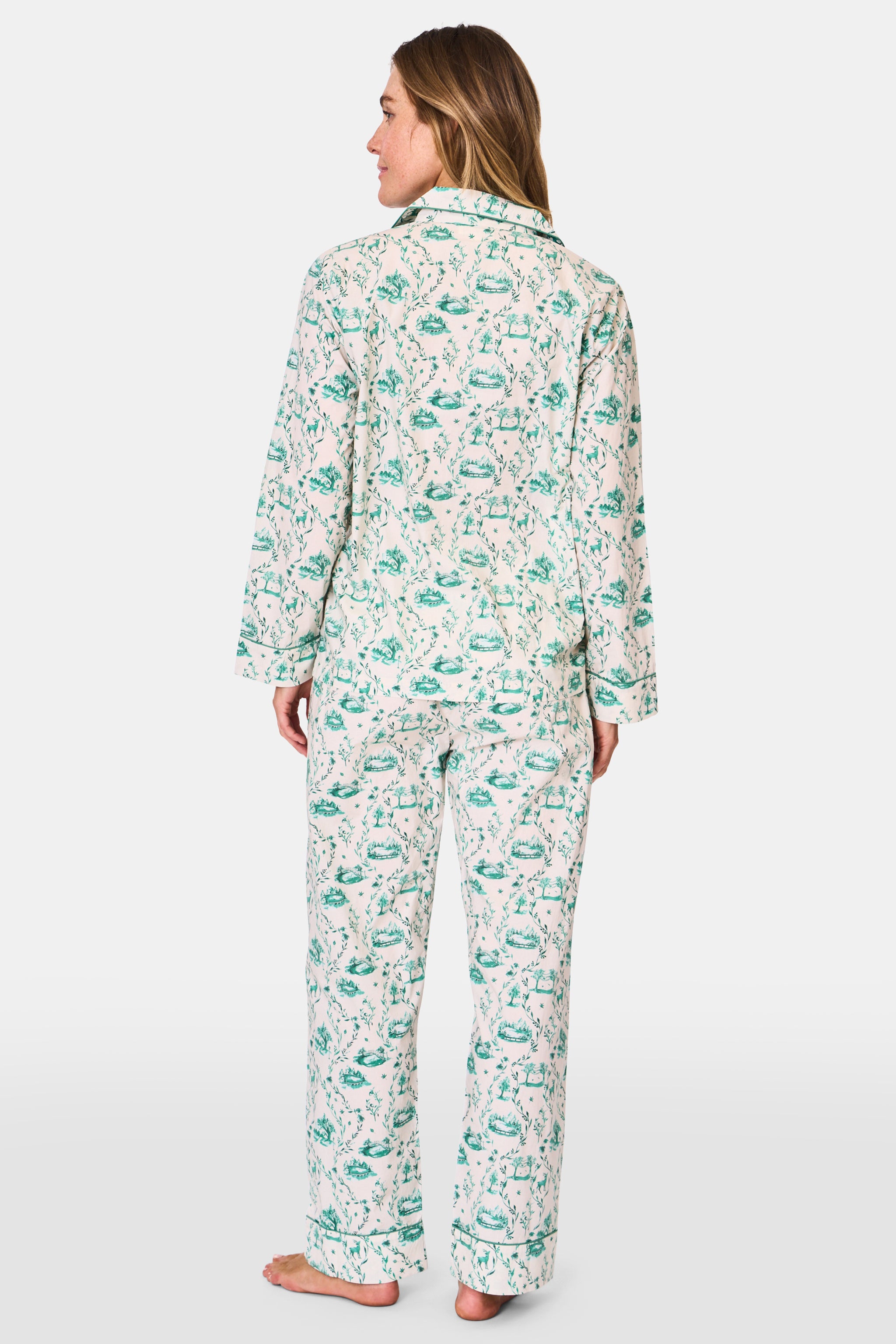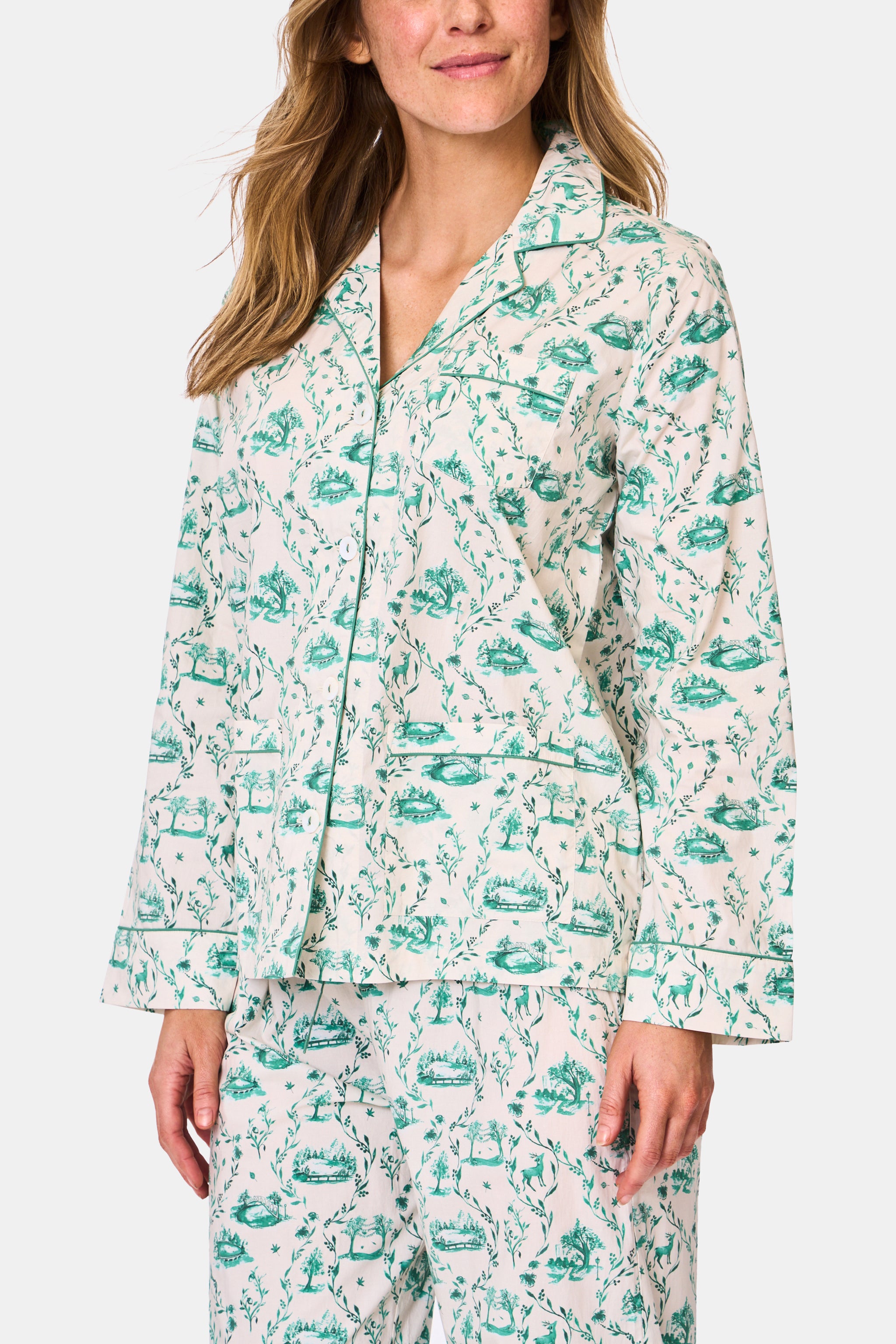 Travel to a fairytale woodland without ever leaving the comfort of your home! Our Woodland Toile Loungewear Set is an enchanting two-piece cotton set inspired by classic pajamas, with a button-front top with stylish piping detail and comfortable, elastic waist pants. The green toile print is adorably detailed with deer and forest imagery.