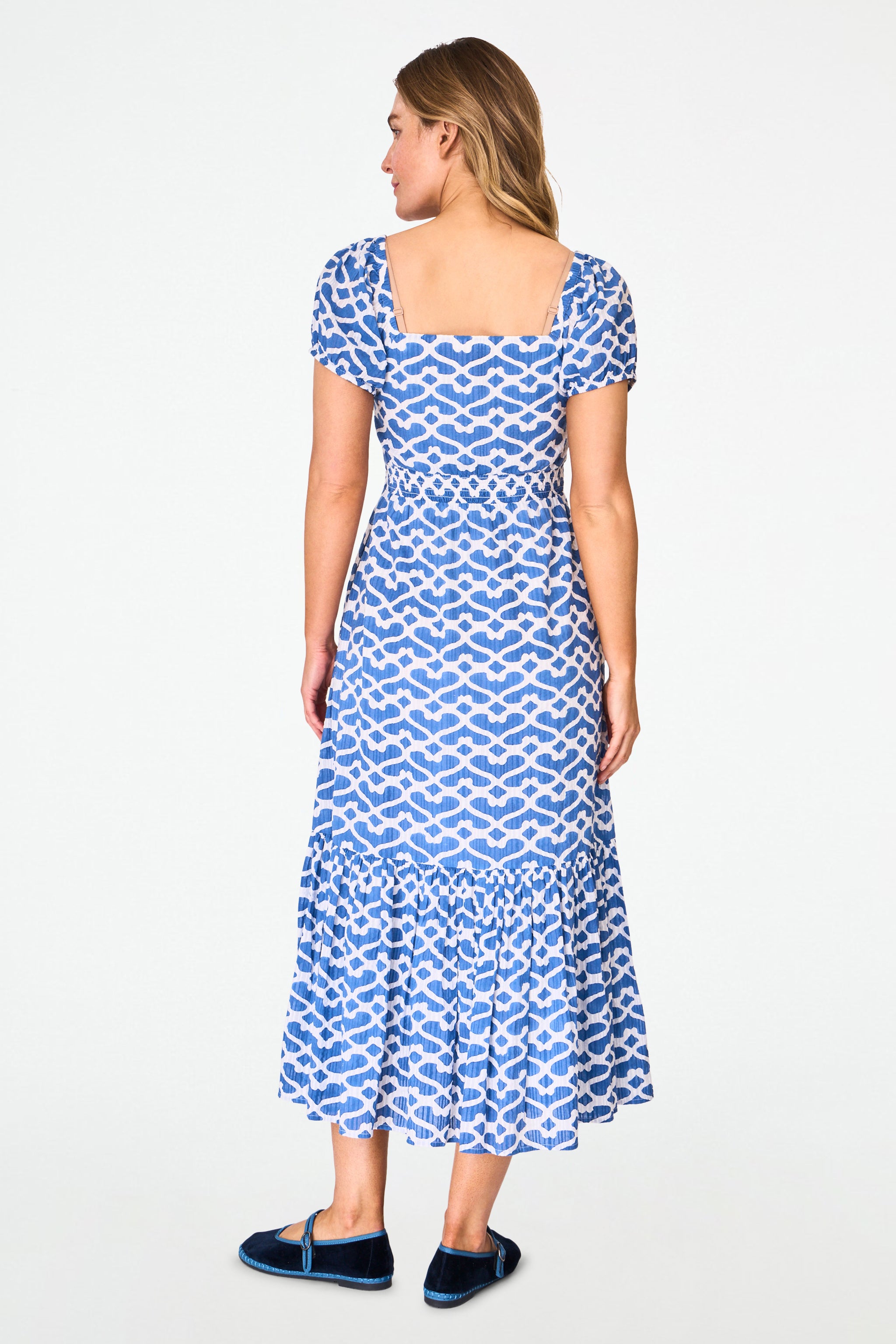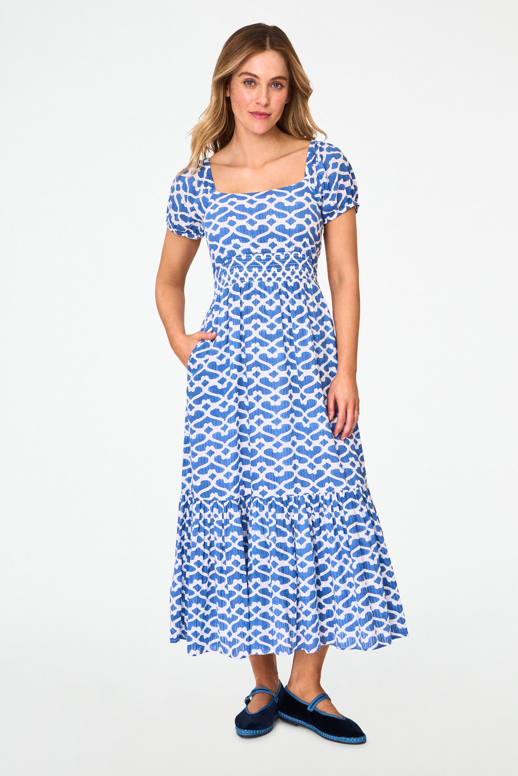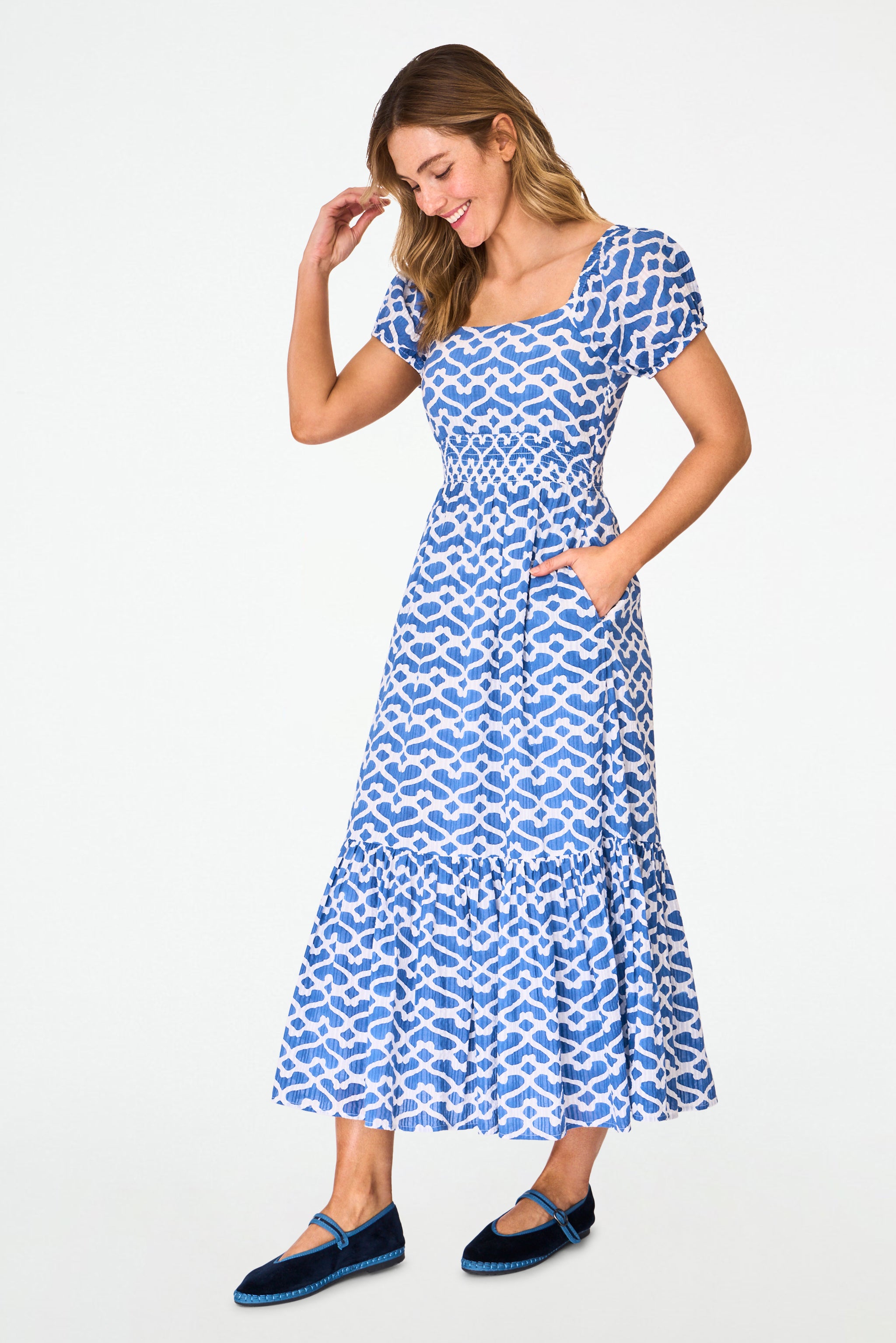 Bridge the gap between summer and fall in the Annika Dress, a maxi-length, short-sleeved dress made of cool, breezy cotton seersucker. The blue-and-white printed dress has feminine cap sleeves, an elastic waist, and side seam pockets for convenience. Wear it today with sandals and add boots and a sweater later.