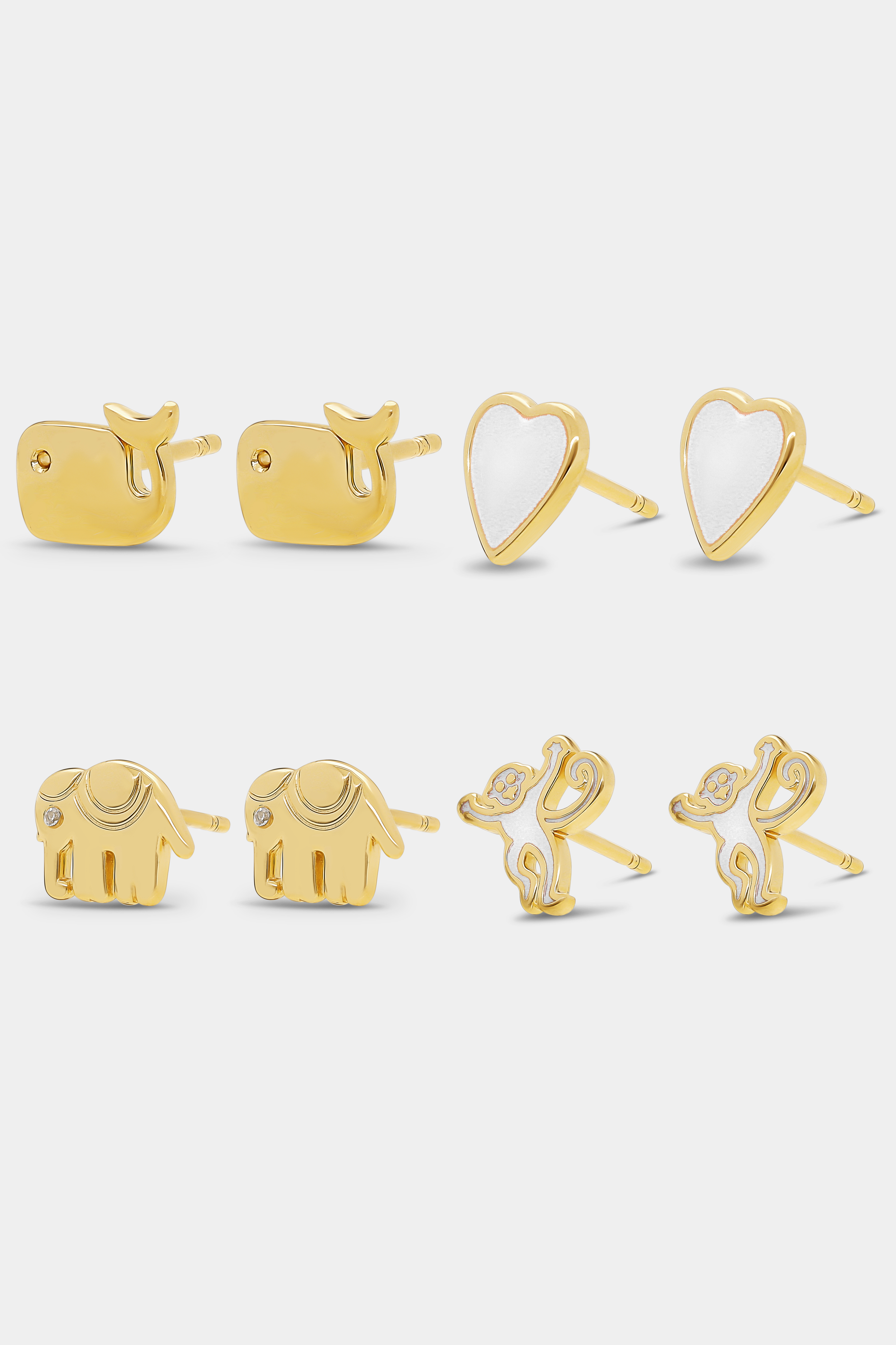 The gang's all here! Mix and match these sweet studs featuring Roller Rabbit icons like Hathi the elephant, Moby the whale, Disco Hearts, and our joyful little monkeys.