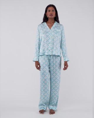 'Tis the season for luxurious loungewear! We've given our classic PJ-style separates an upgrade in lush silk and our signature, vintage-inspired Jemina print. This two-piece Ice Blue set can be worn to bed, for movie night, or out and about this Winter season.