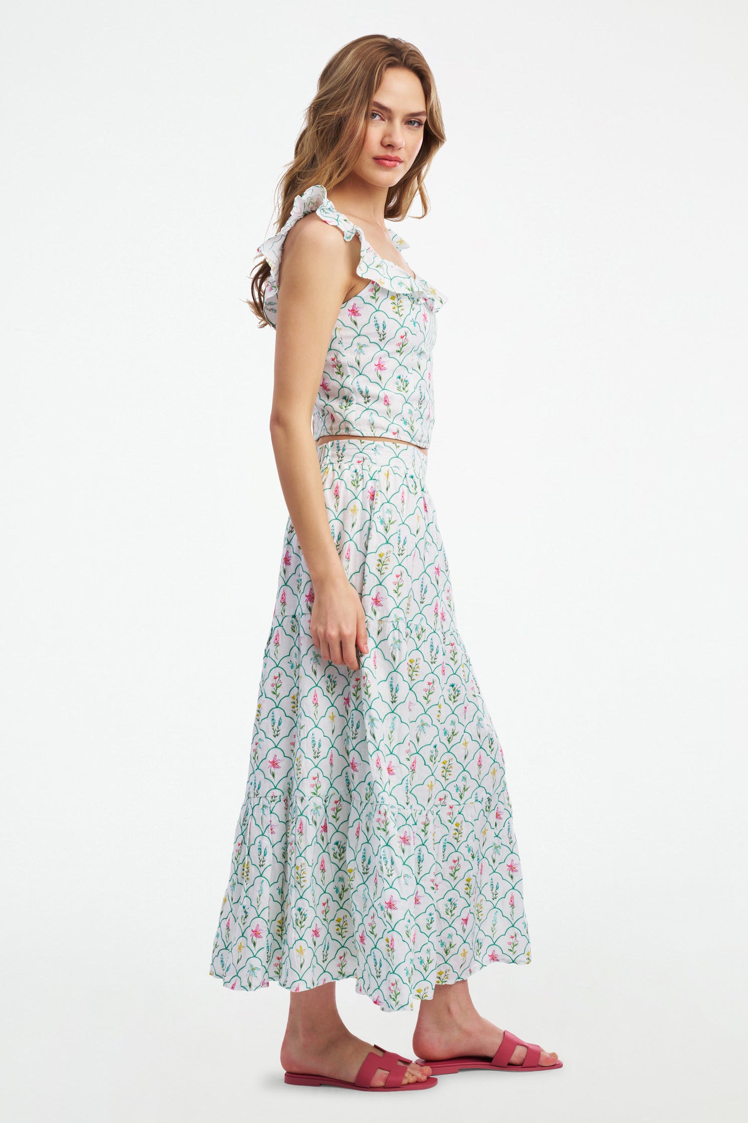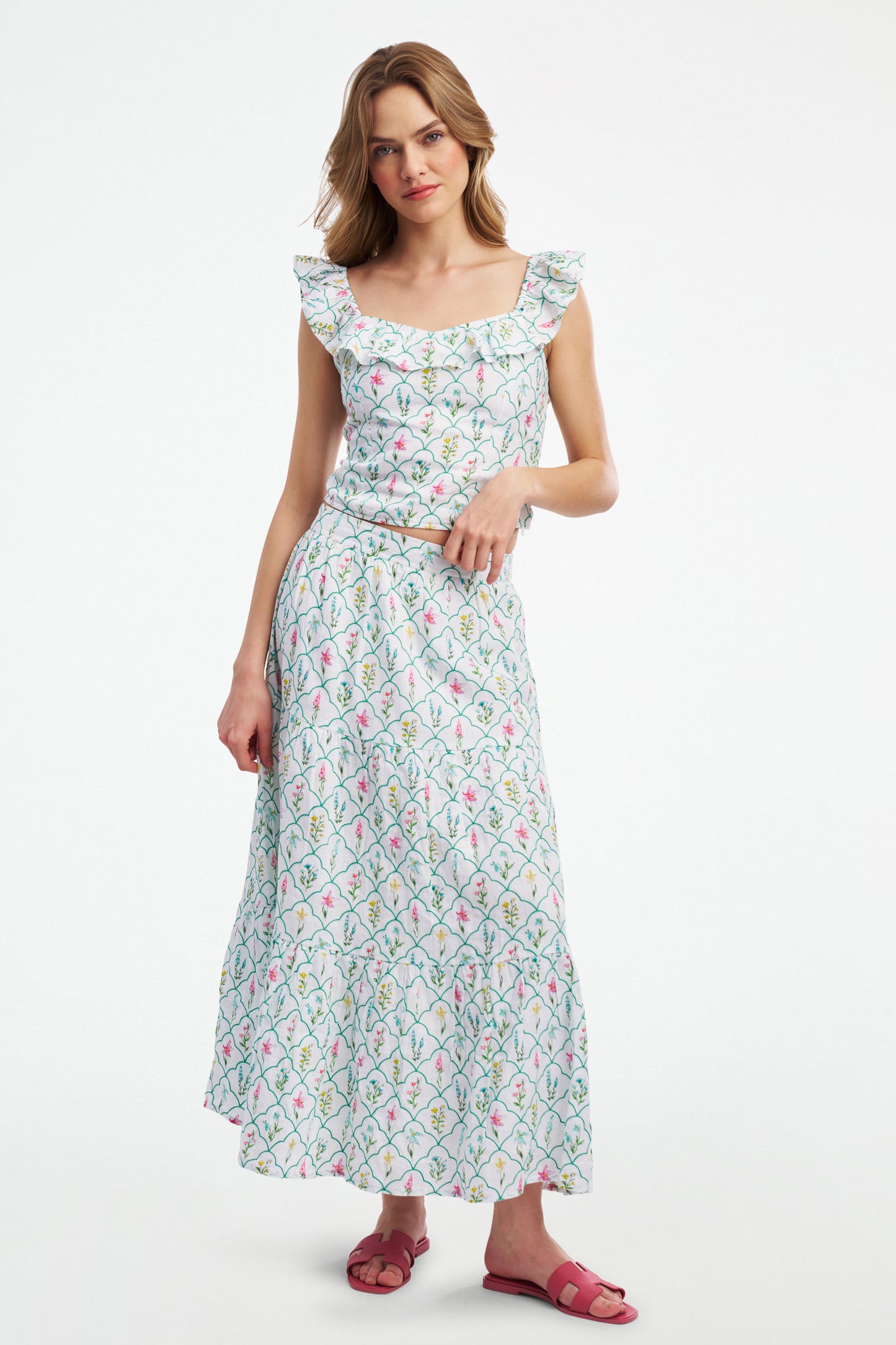 So dreamy, so summery, so simply pretty. The Carlisa Skirt is a long, tiered linen maxi skirt in a darling floral print. An invisible side zipper ensures a perfect fit. Pair it with the matching Khalia Top for a romantic summer moment.