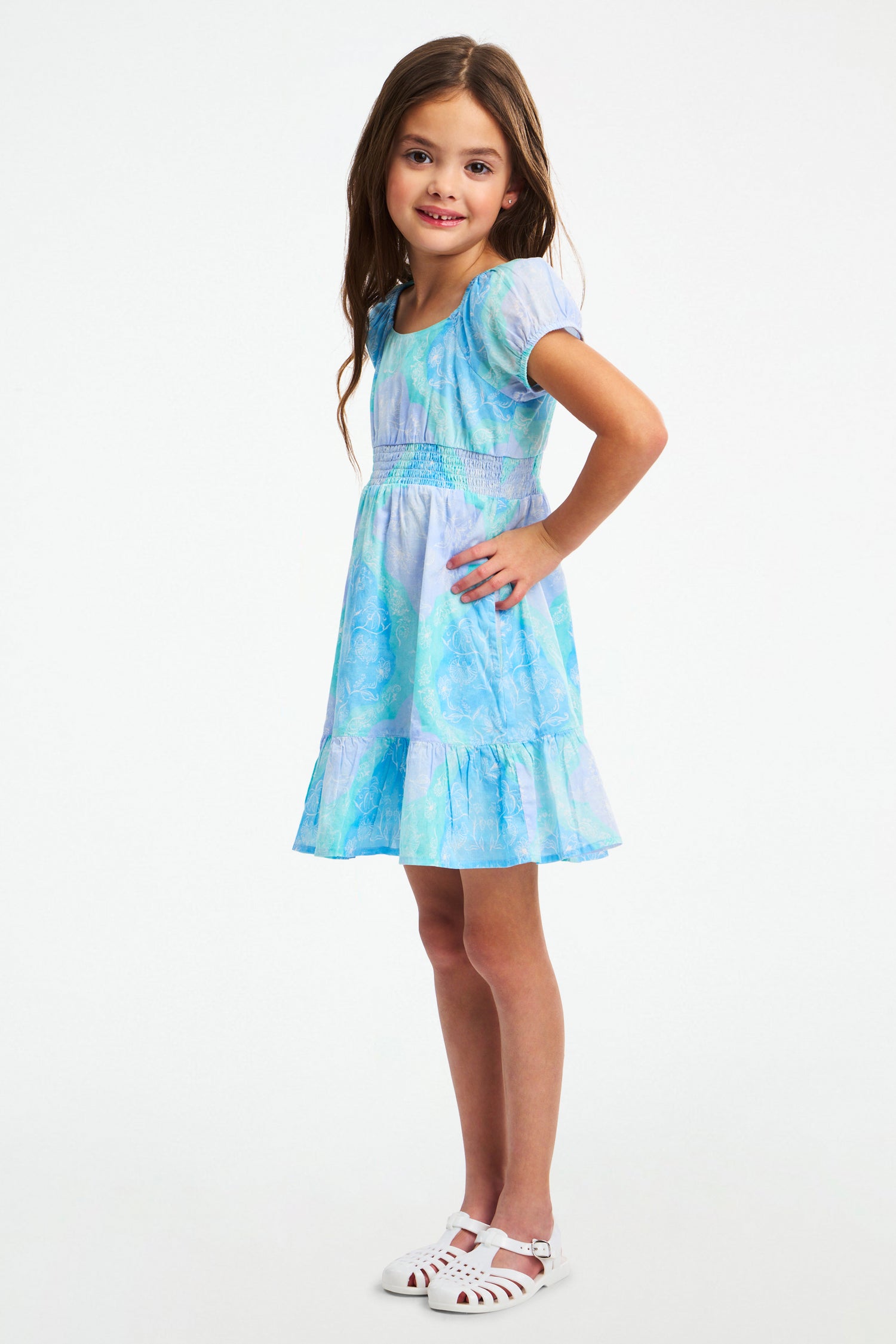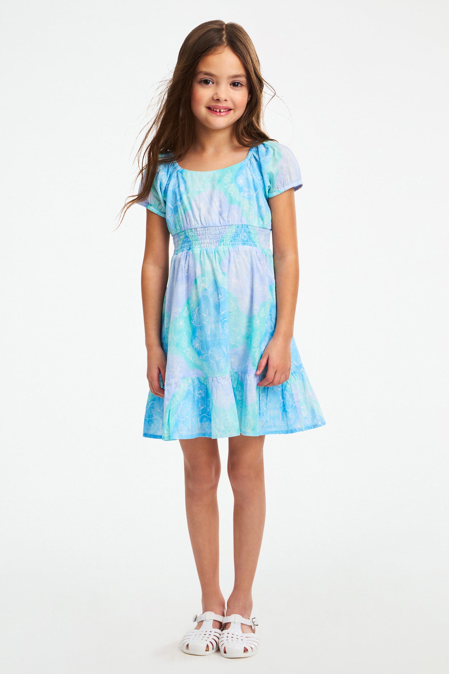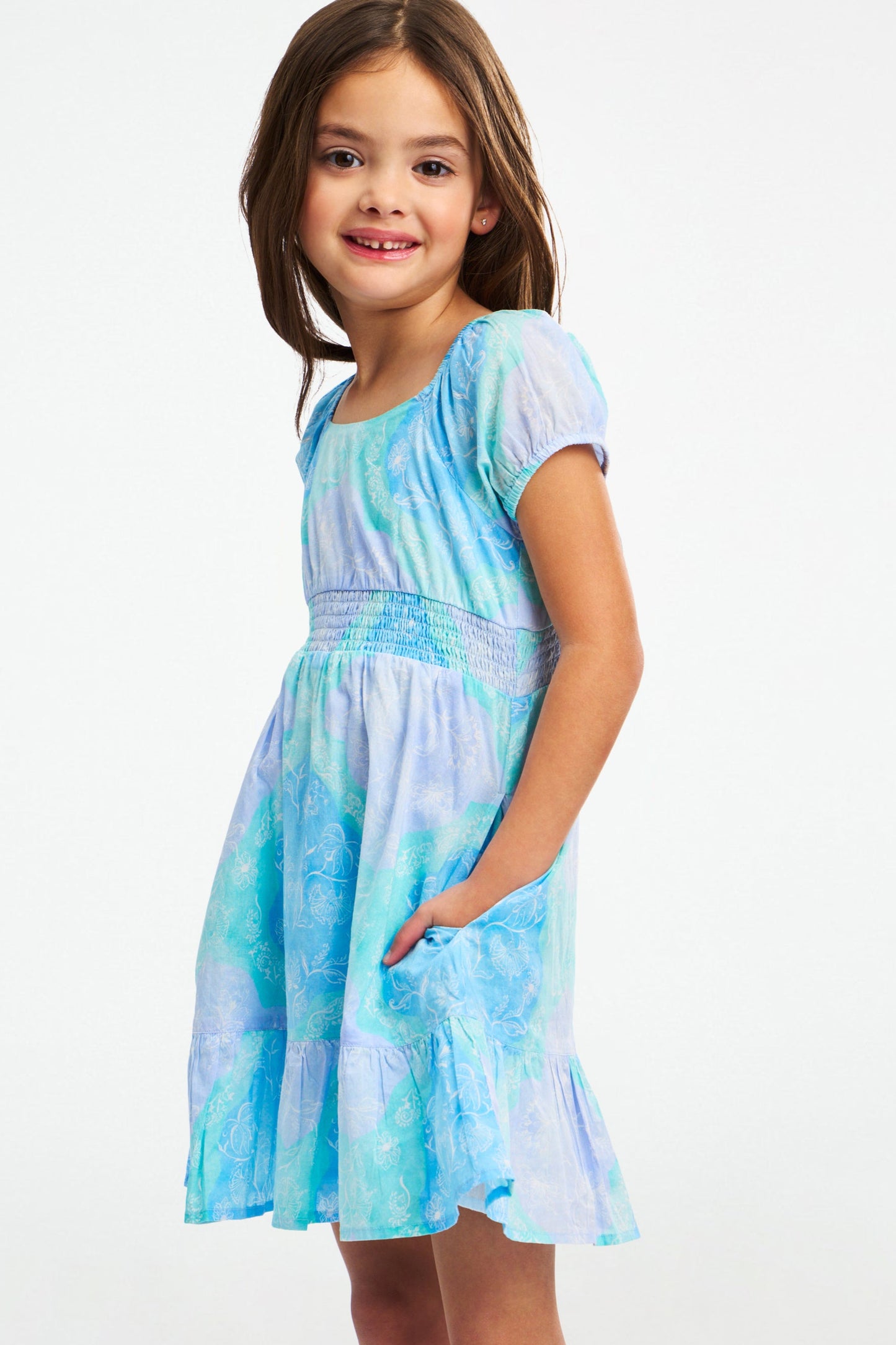 So dreamy! The Kids Arna Dress is a pastel delight with a smocked empire waist, puffed sleeves, and a delightful ruffled hem. The ethereal blue and green Samira print feels like a lazy, hazy summer day.