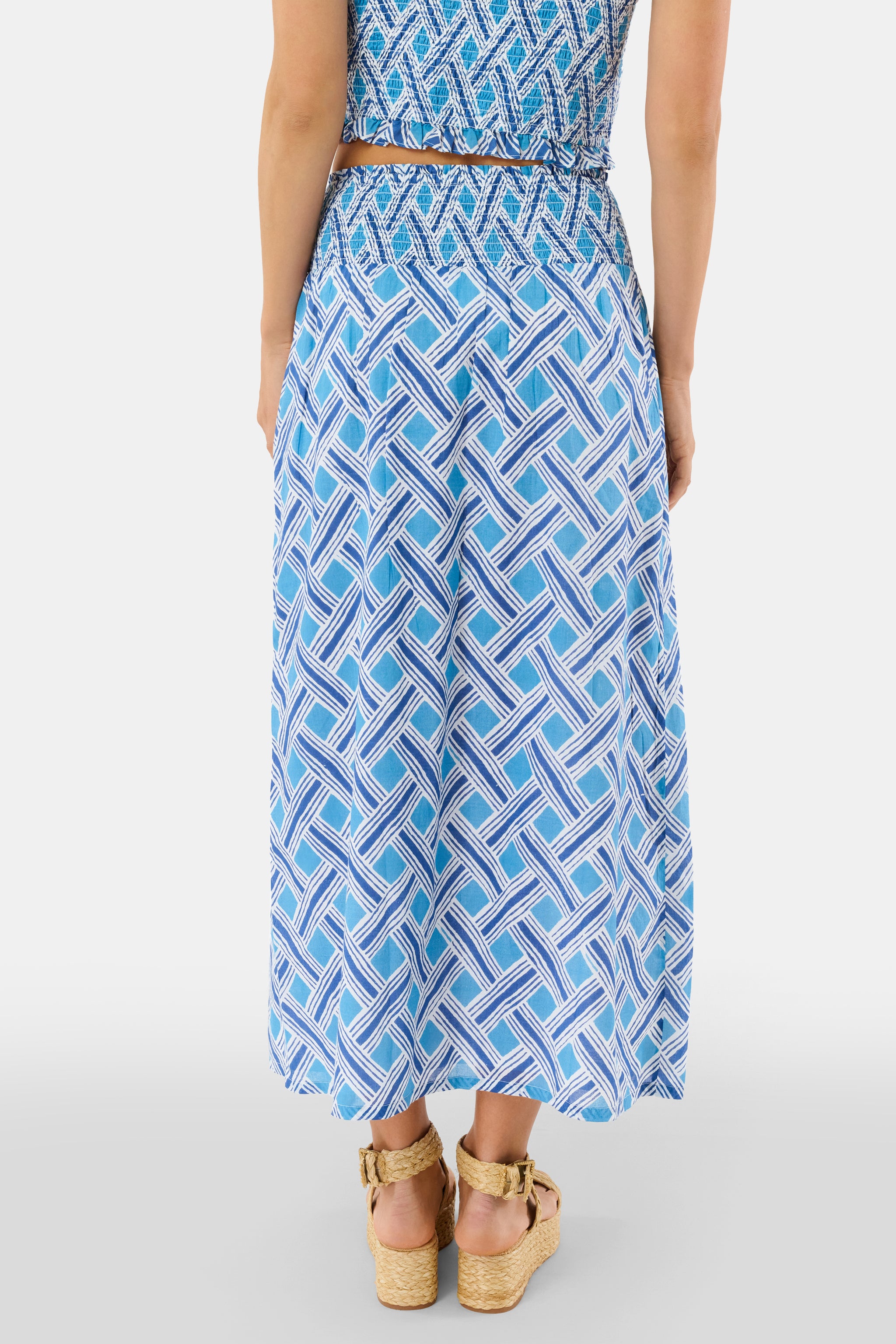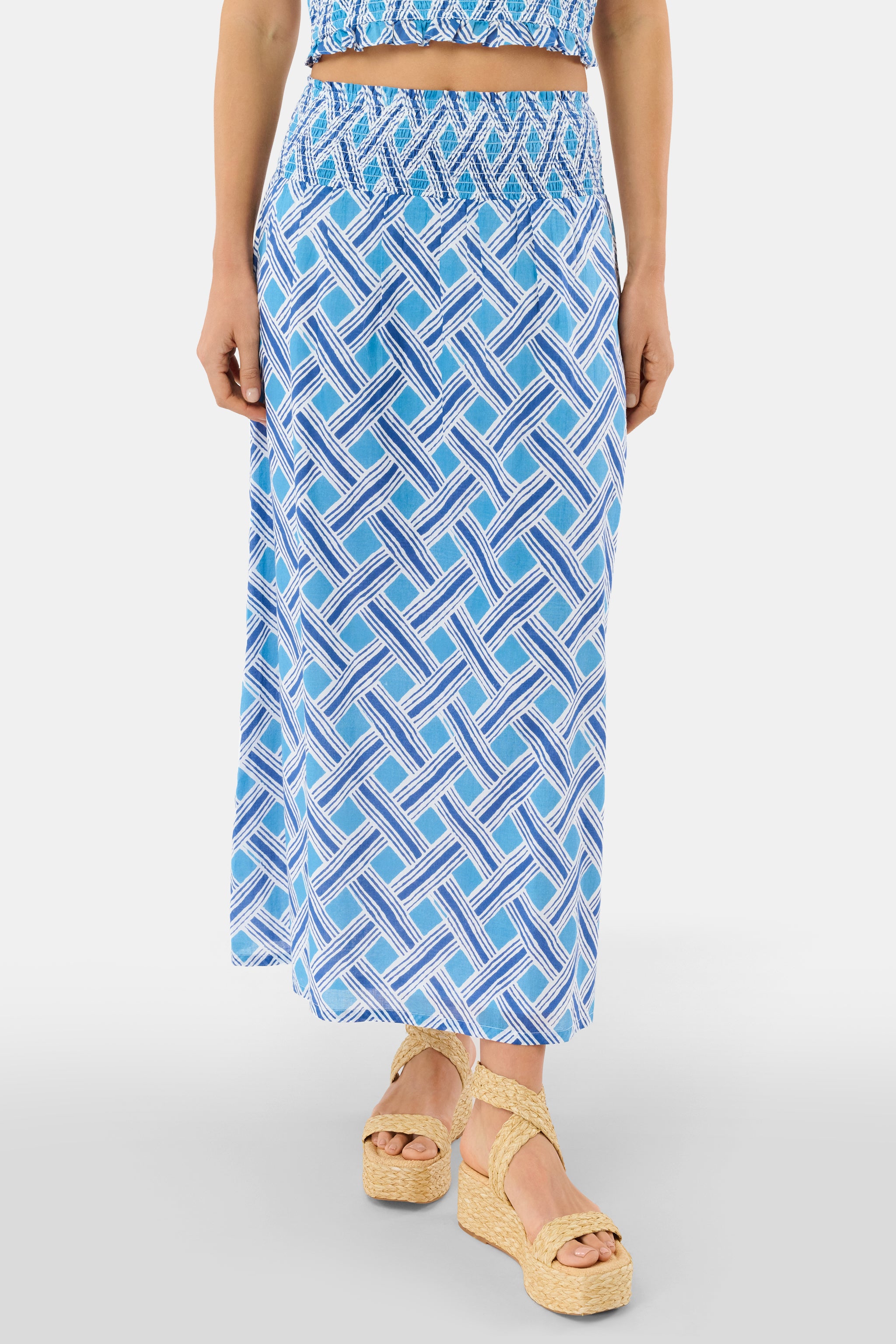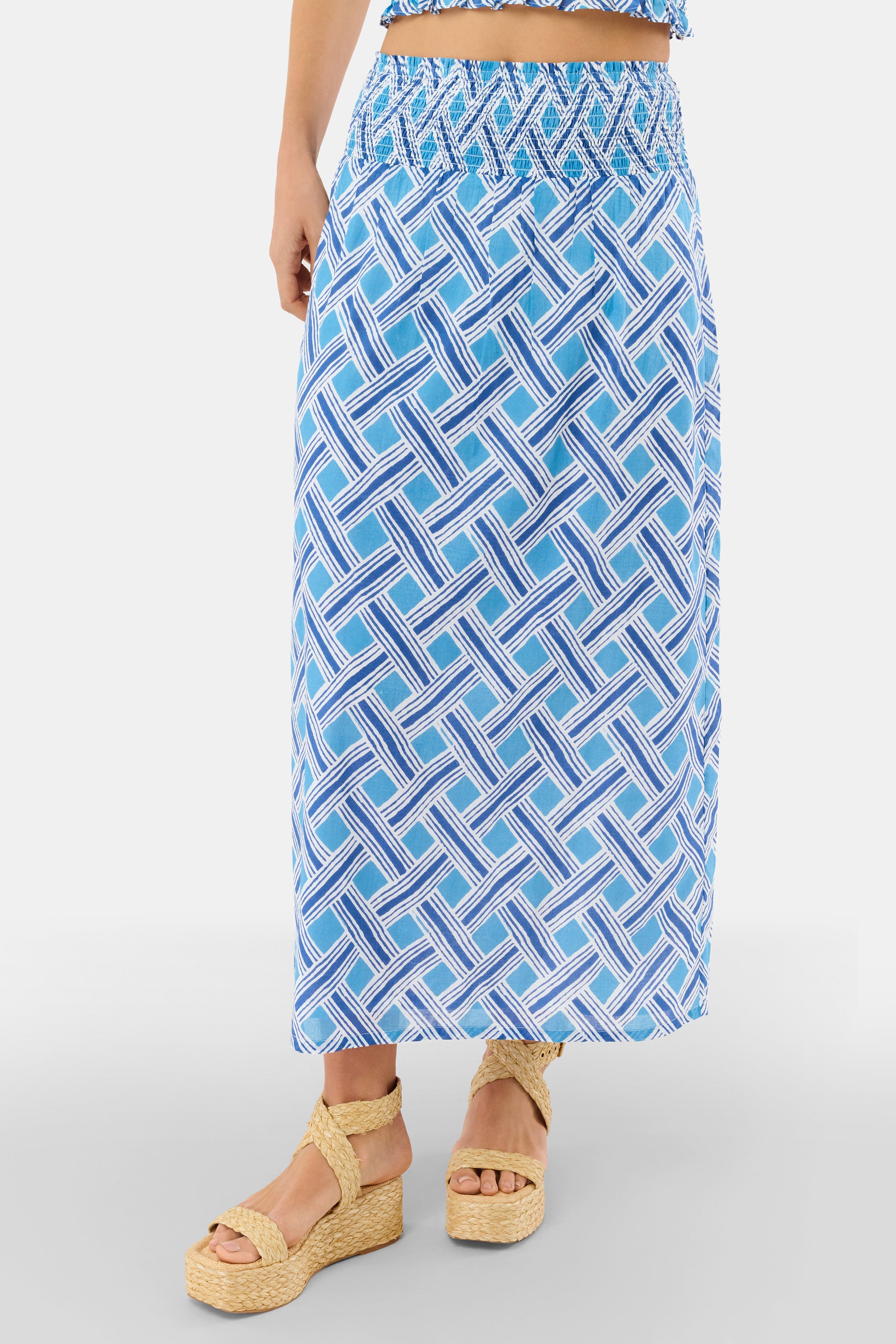 Infuse your look with coastal chic in the Juliette Skirt, a long cotton voile maxi with a pull-on smocked waistband and luxurious blue Liana print.