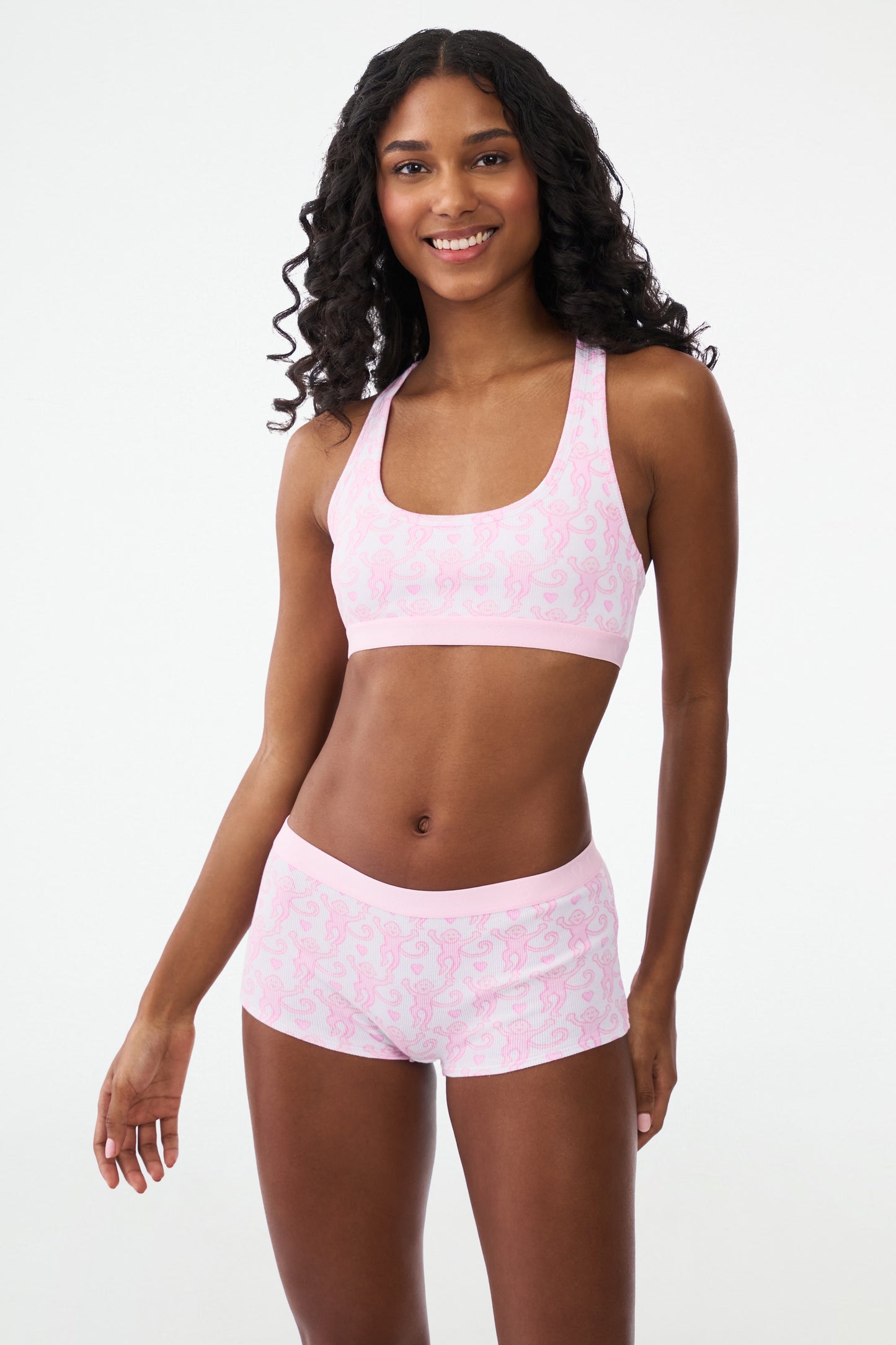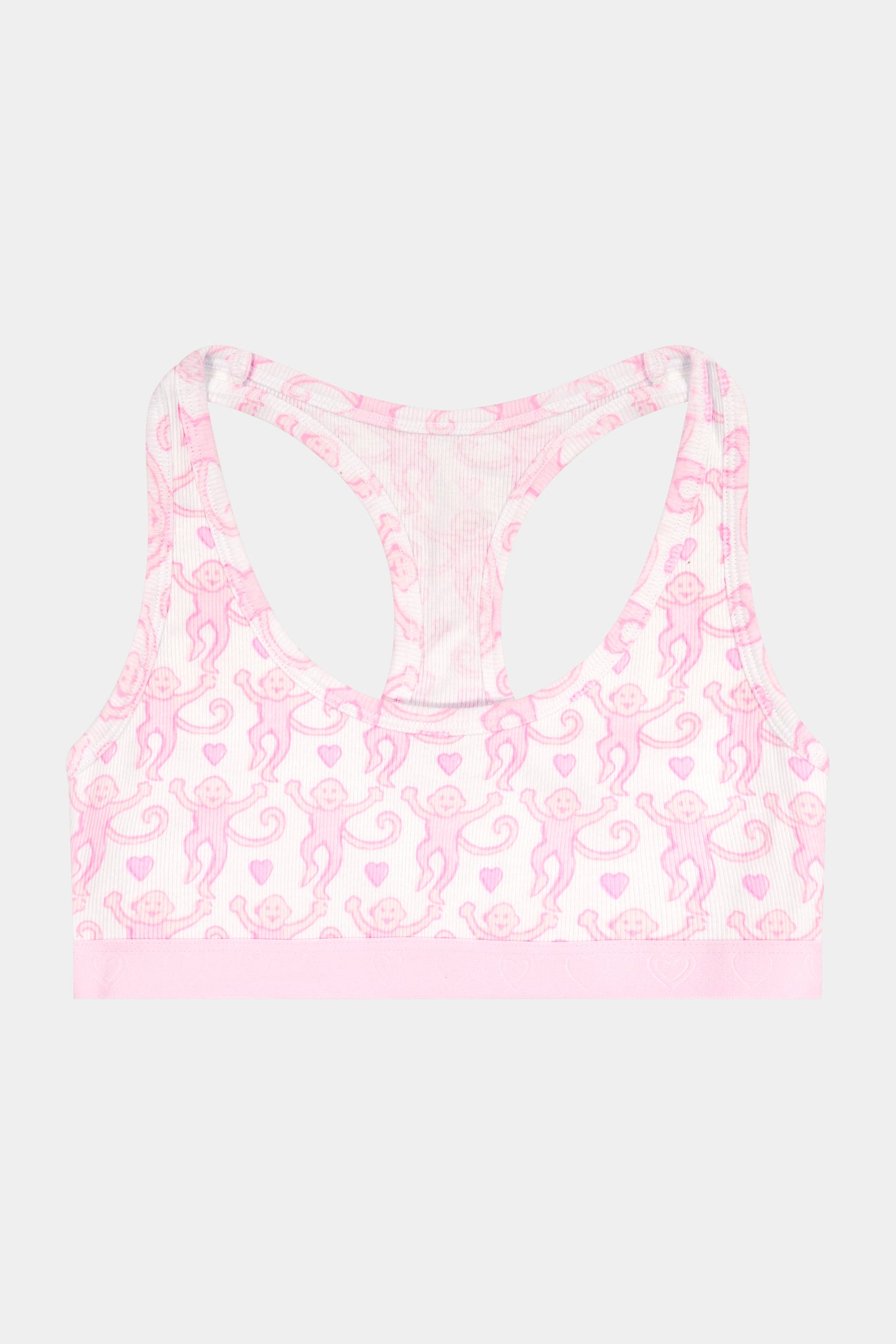 Getting dressed is so much more fun with the Madison Racerback Bralette. This pullover style in soft pima modal is lightly supportive and comes in the most whimsical, pale pink monkey print.