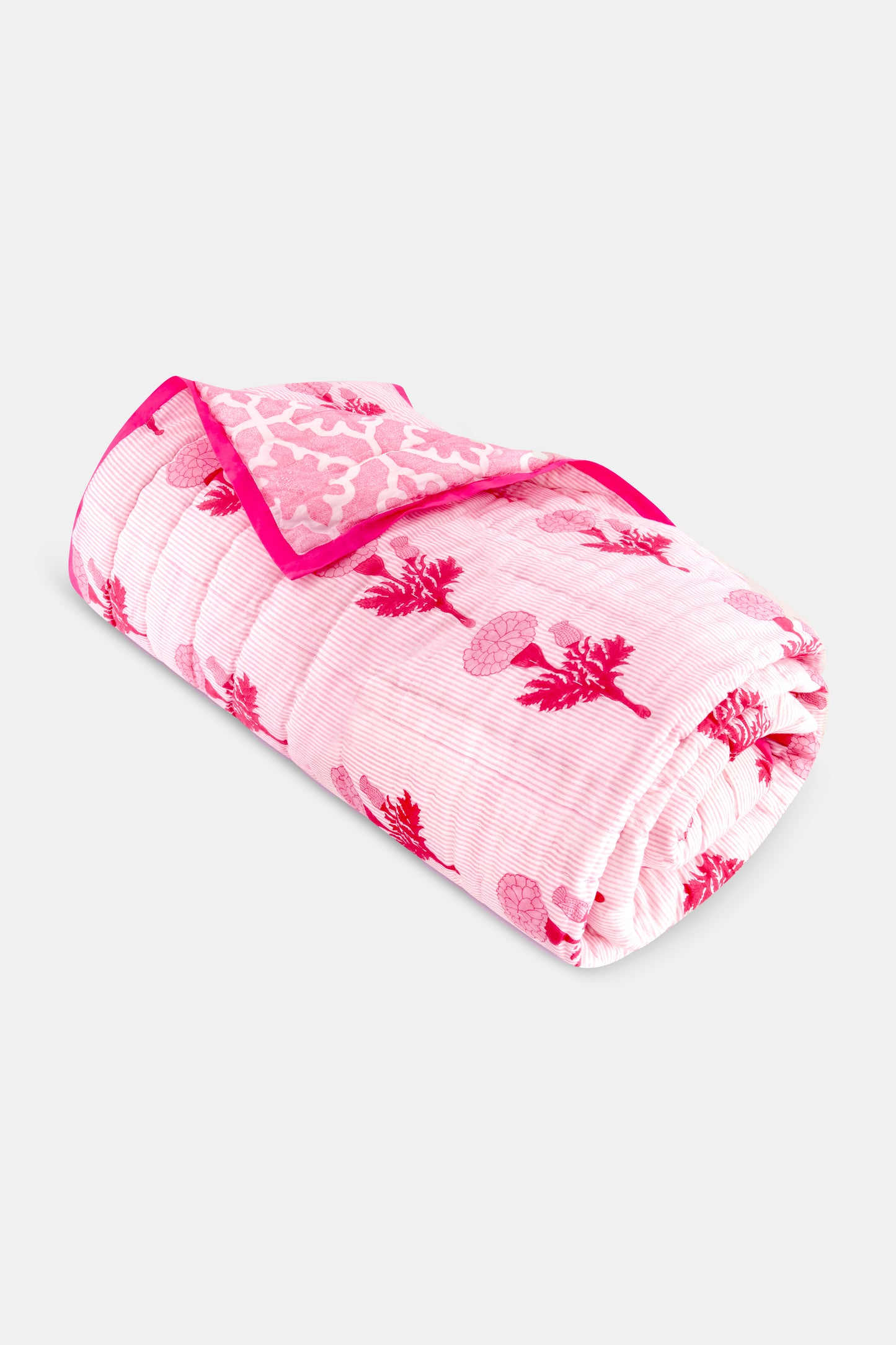 It's two quilts in one. This reversible cotton quilt features the red Monaco Pool print on one side and the pink-and-red Marigold Floral on the other. With all three sizes, you can turn your room into a Summer retreat, use it as a throw or a very stylish picnic blanket.