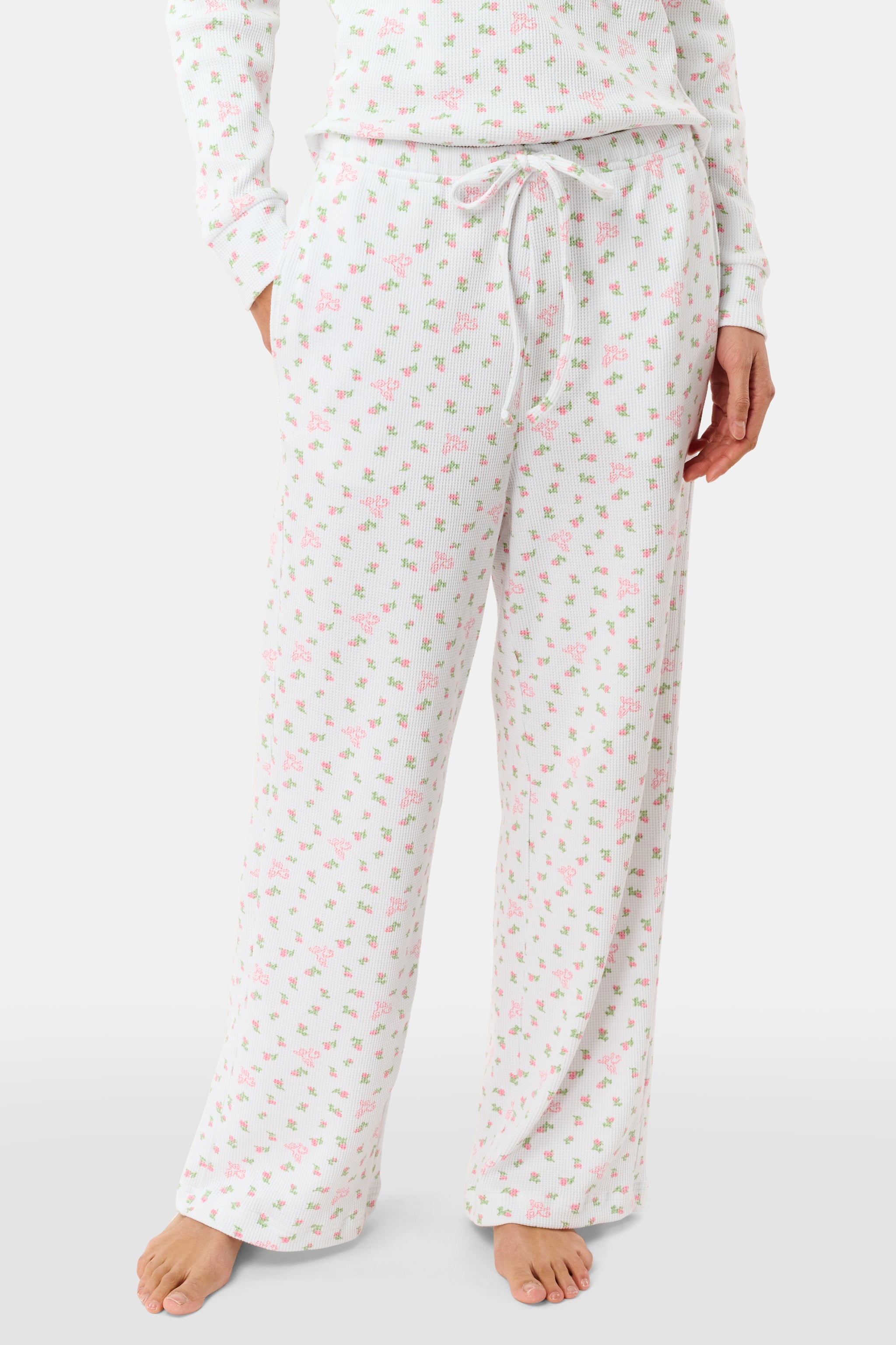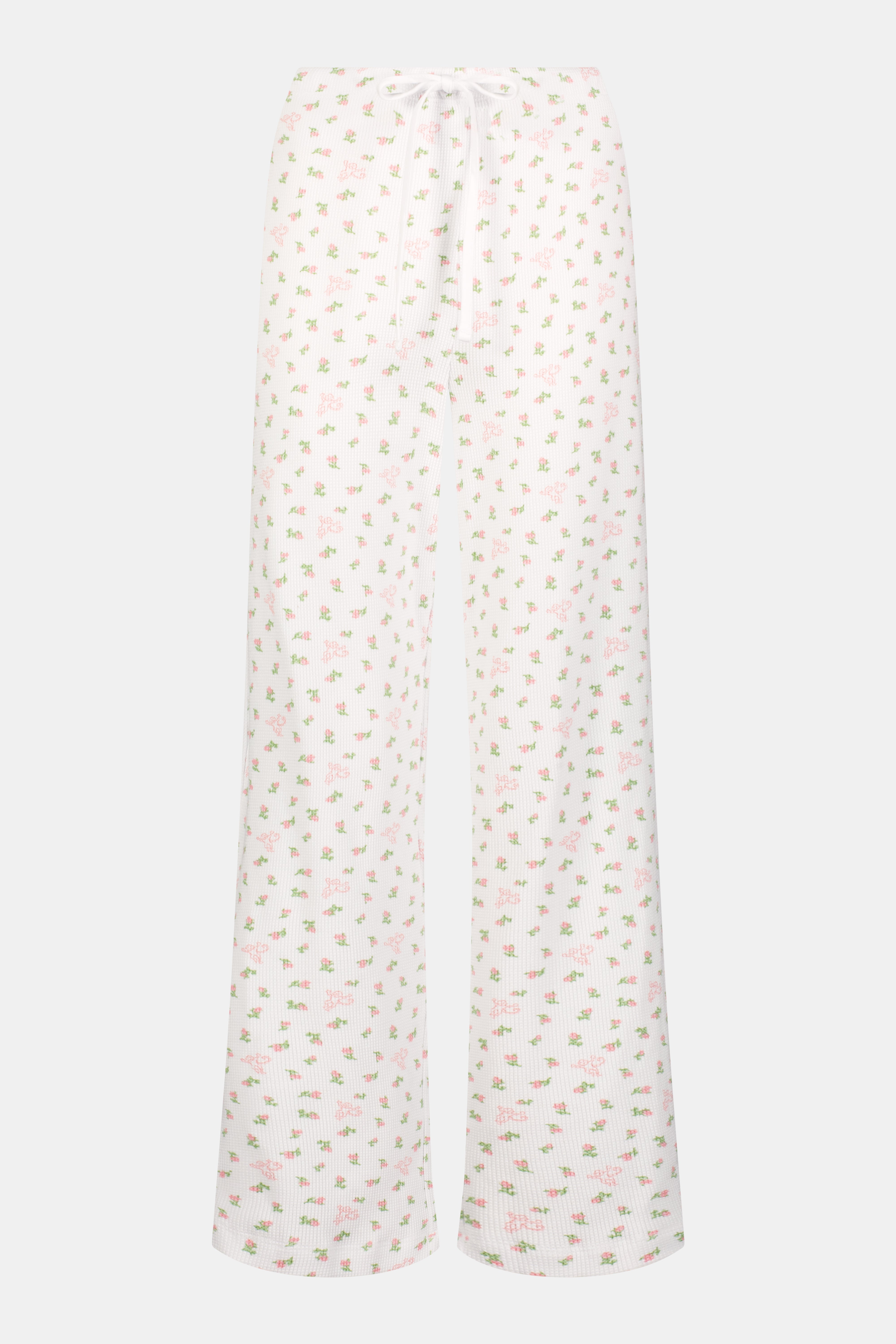 Treat yourself to cute comfort with the Julienne Pant, a high-rise, wide-legged Pima Waffle pant in an enchanting Mini Monkey Blossom print.