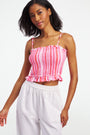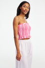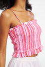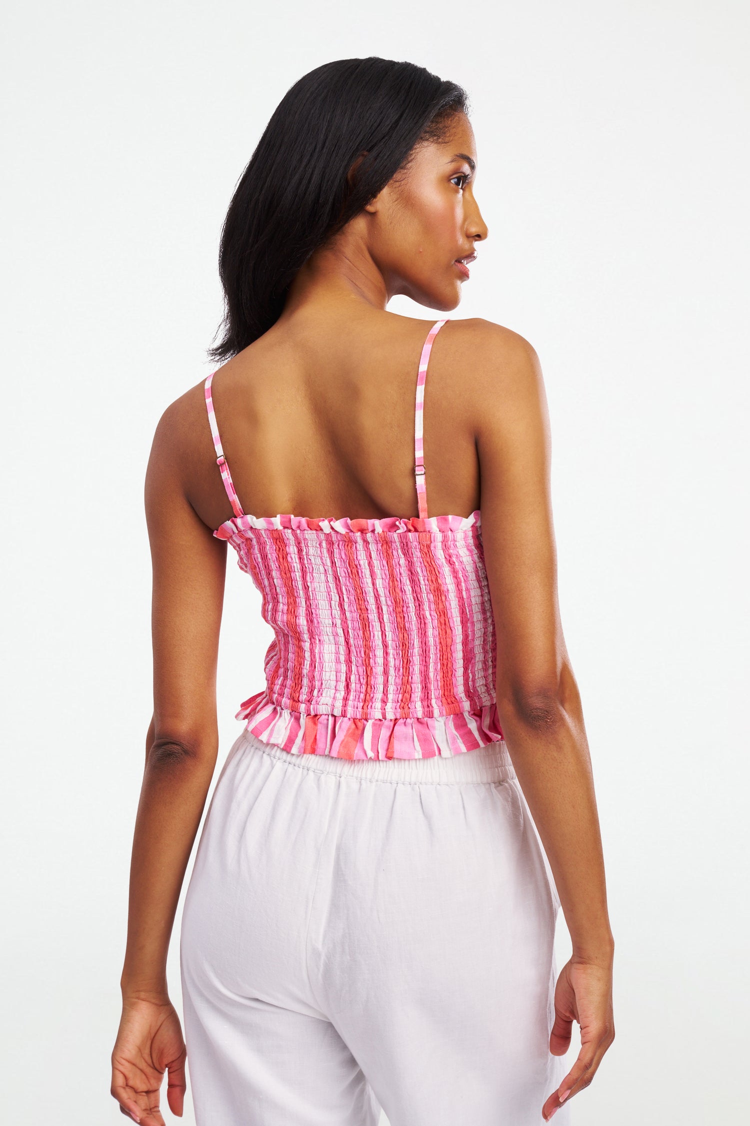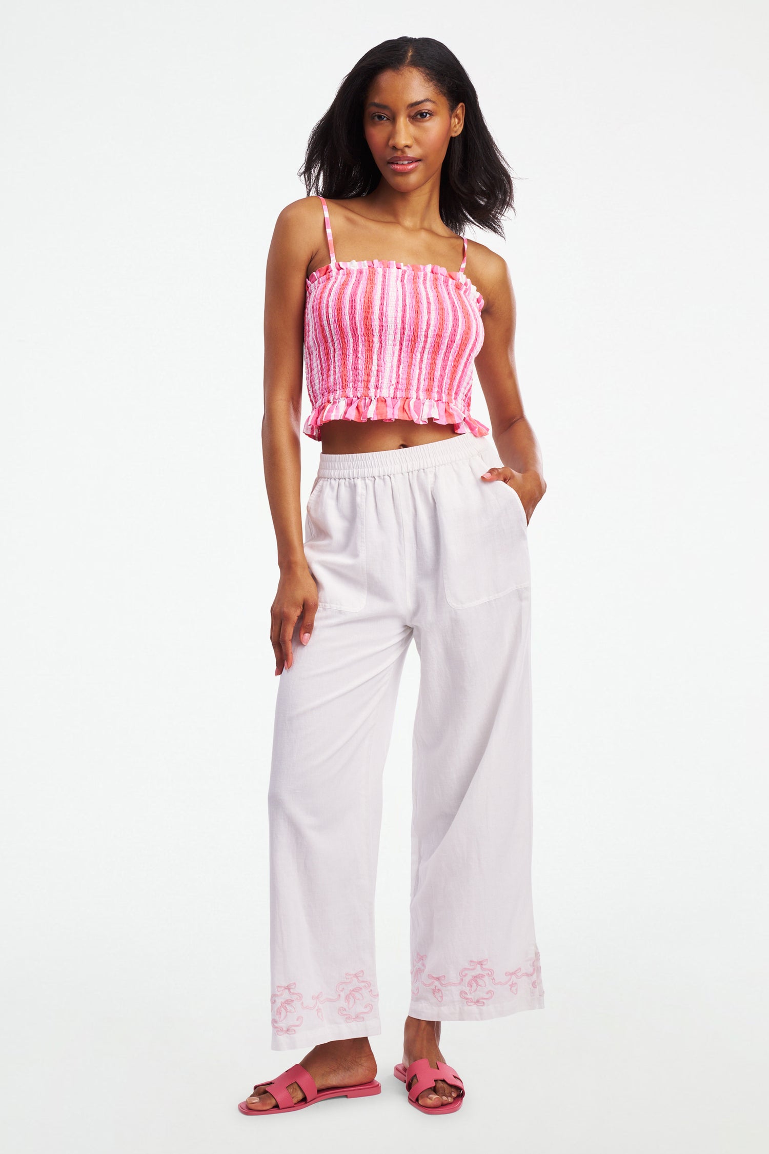 The Hali Top conjures up visions of boardwalk strolls, weekend getaways, and hot summer nights. With a smocked bodice, delicate spaghetti straps, and a subtle ruffle trim, it's flirty and fun—and perfect with high-waisted pants.