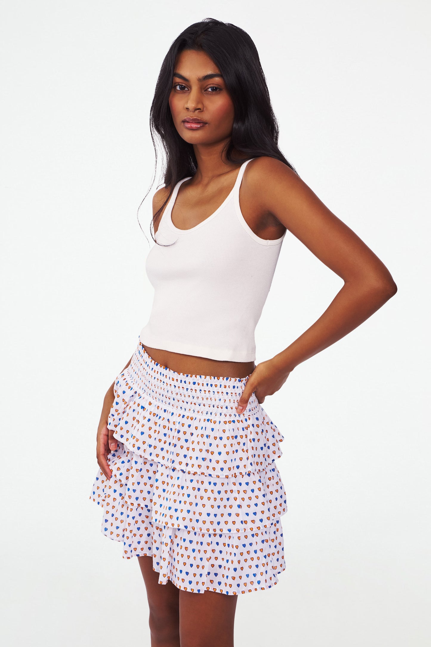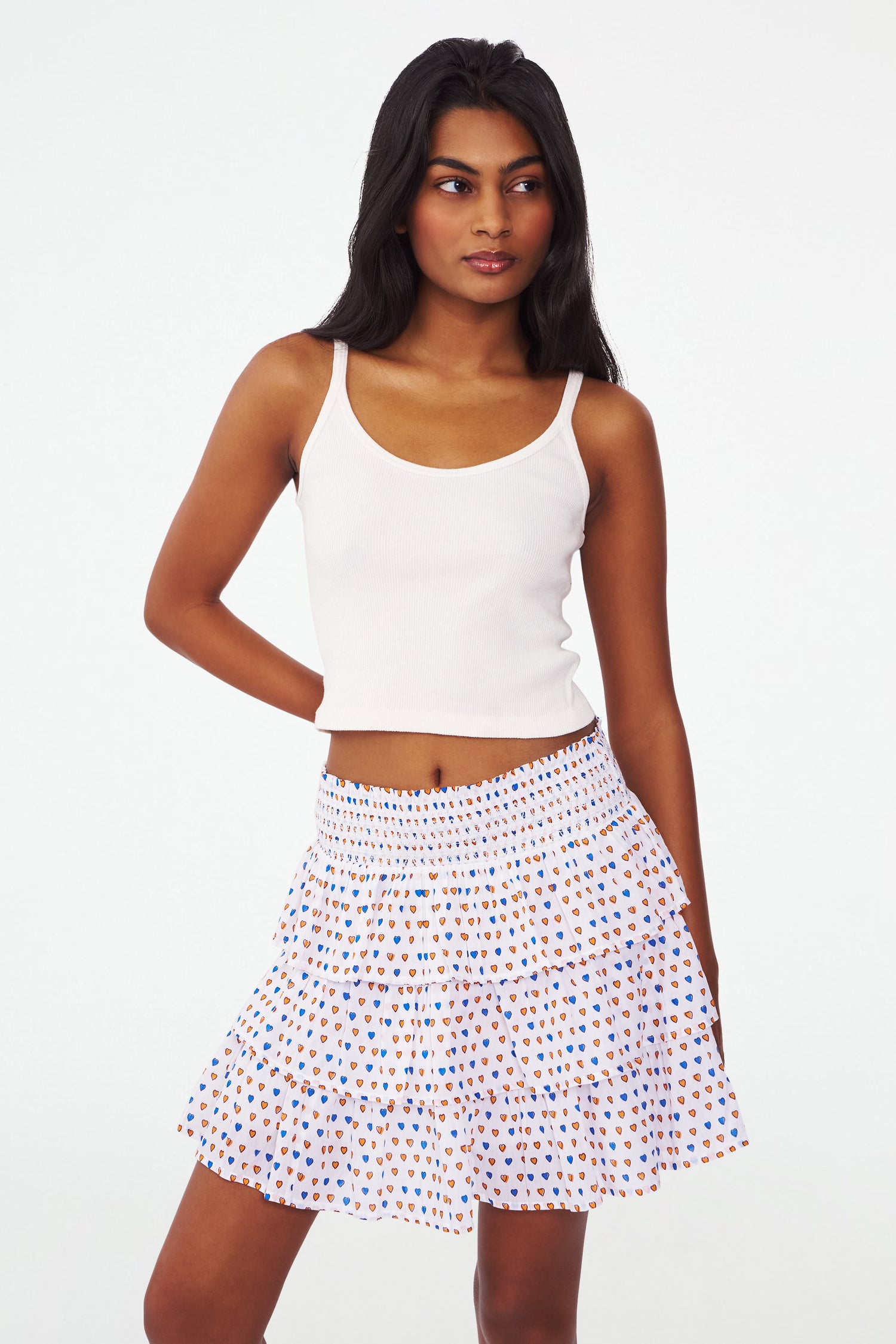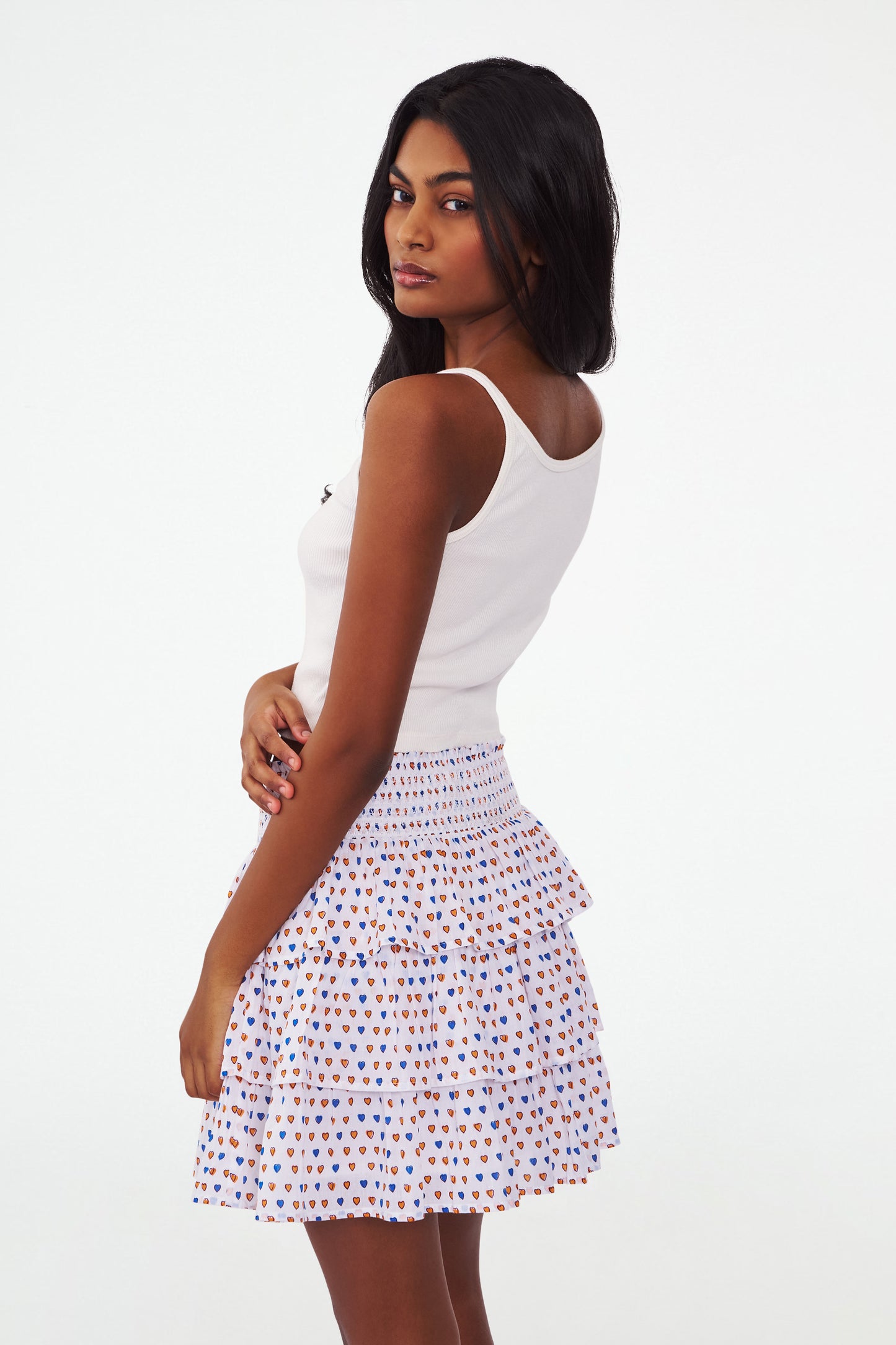 The Siggy Skirt is our smocked waist-tiered ruffle mini, designed in our Pop Hearts print.