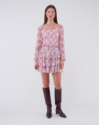 Why do we love the Siggy Skirt? It's the ultimate mini, with layers of flirty ruffles and an easygoing smocked waistband. The Rose Ribbon print is elevated and perfect for the holiday season!