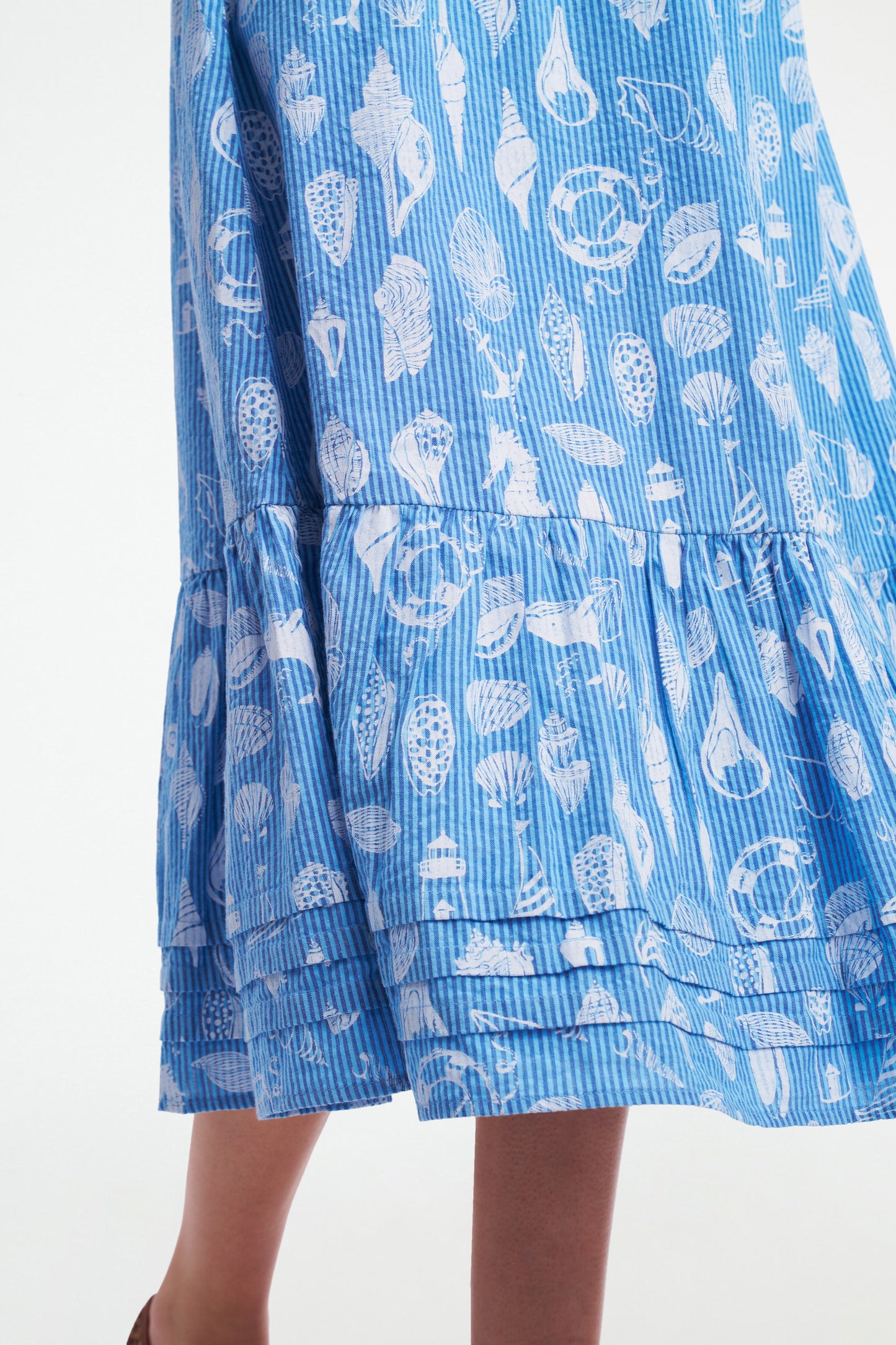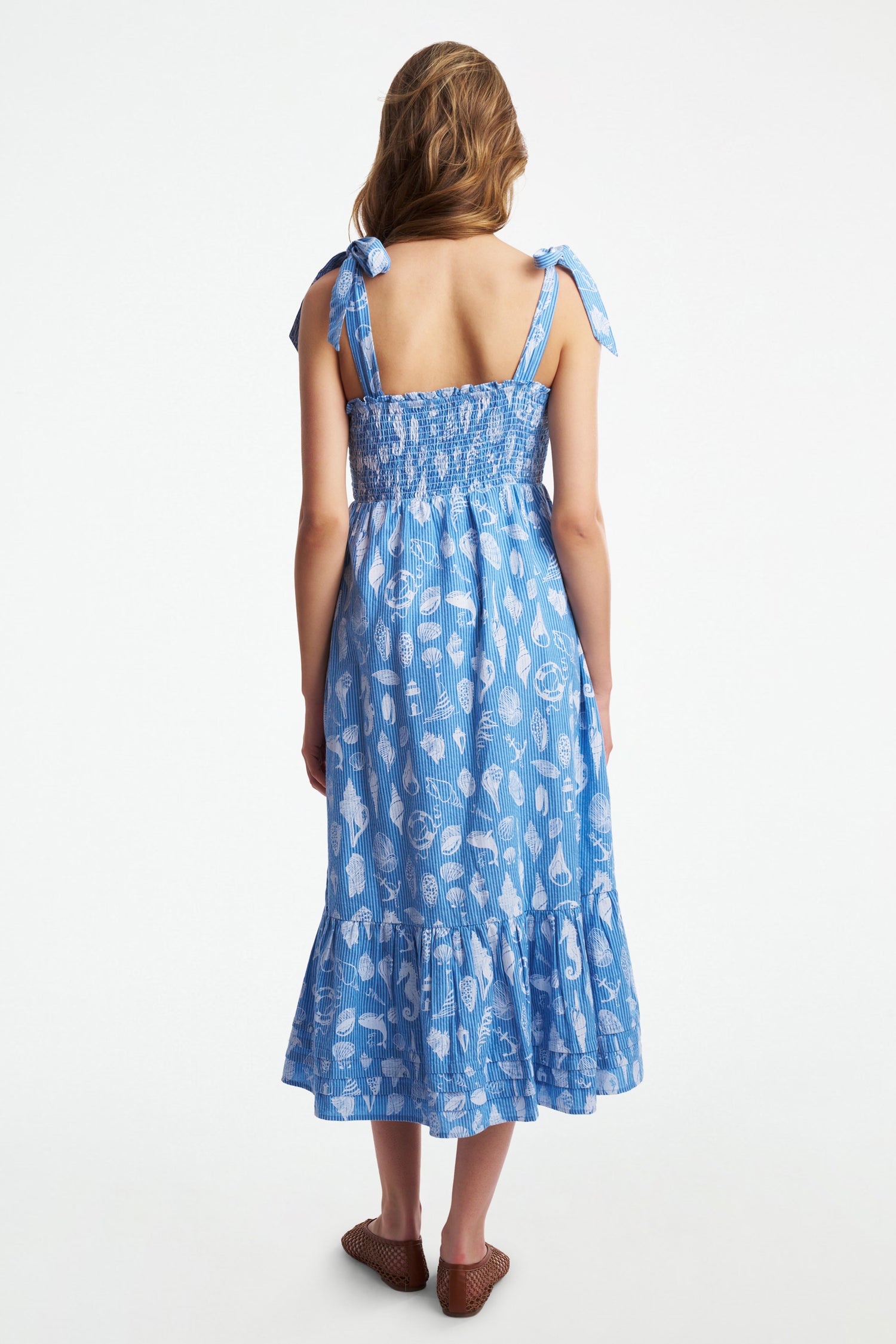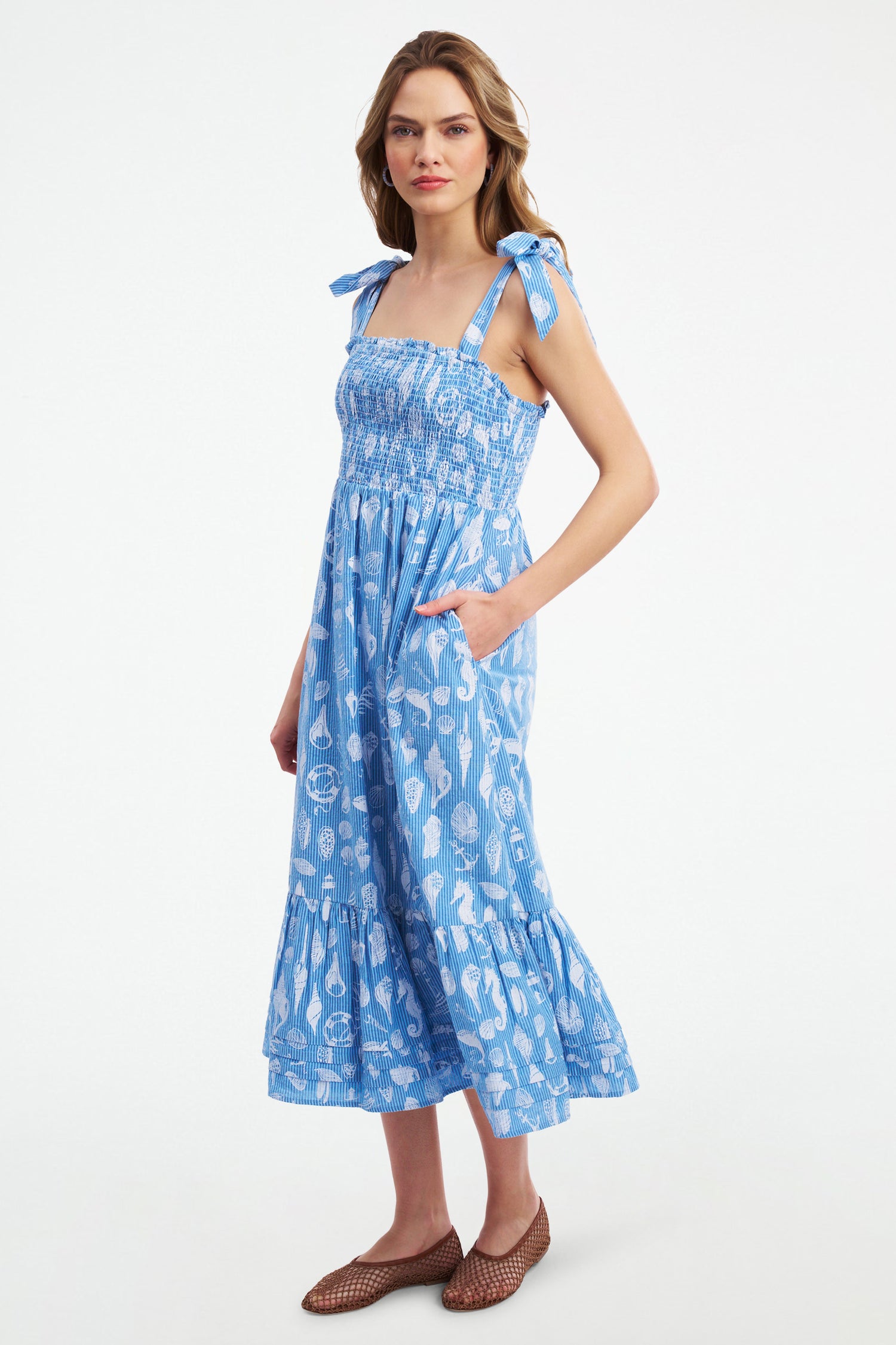 Seersucker and summertime go together like iced tea and lemonade. The Georgina Dress is perfect for sunny days and getaways, thanks to its lightweight fabric, smocked bodice, oceanic Seaside Print, and versatile, dress-it-up, dress-it-down silhouette.