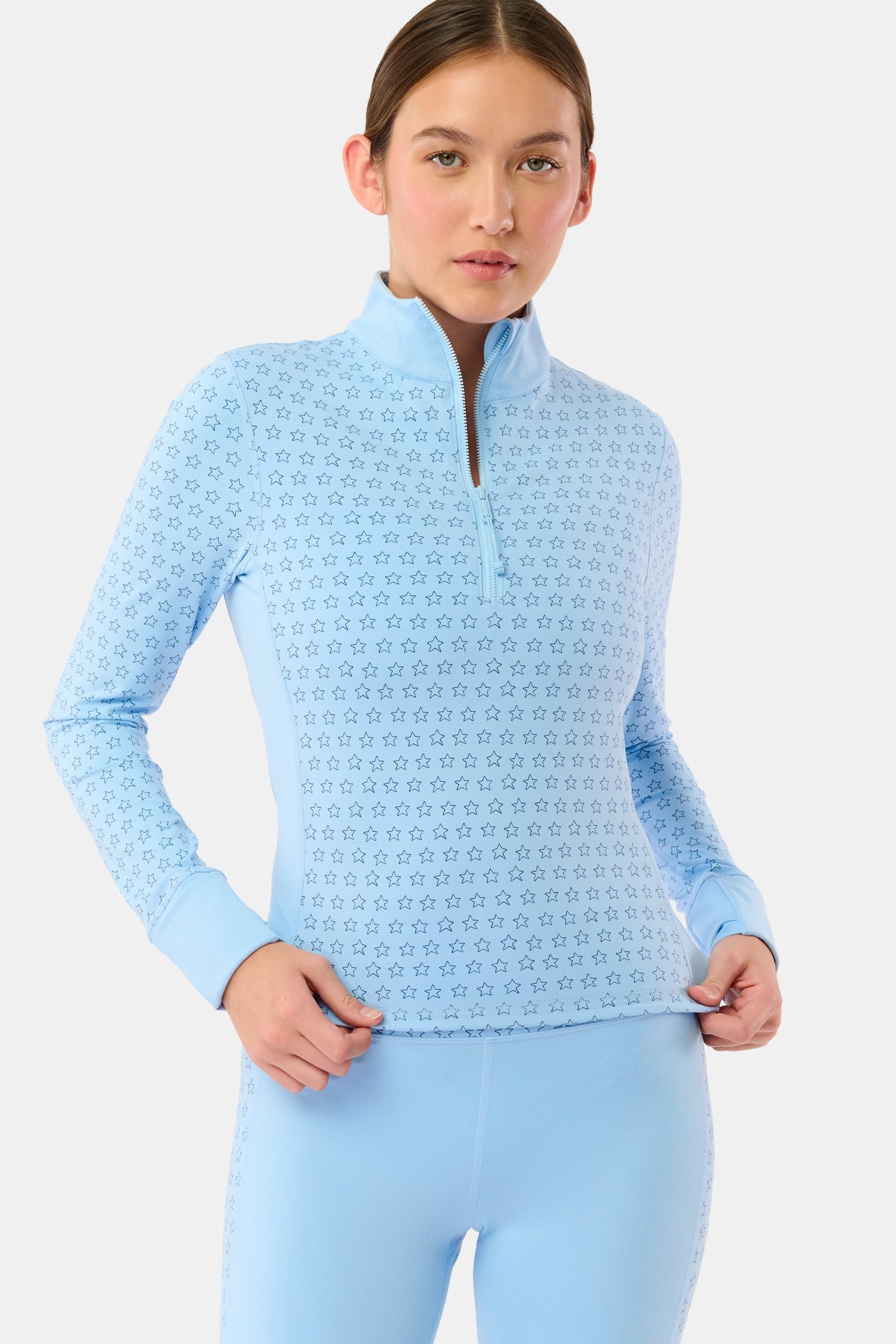 Give your gym wardrobe a spring refresh in the Celia Quarter Zip Jacket, a sky blue style in a stretchy poly blend. Little details like a high neckline, delicate star print, and thumbhole sleeves make it a must-have for your routine.