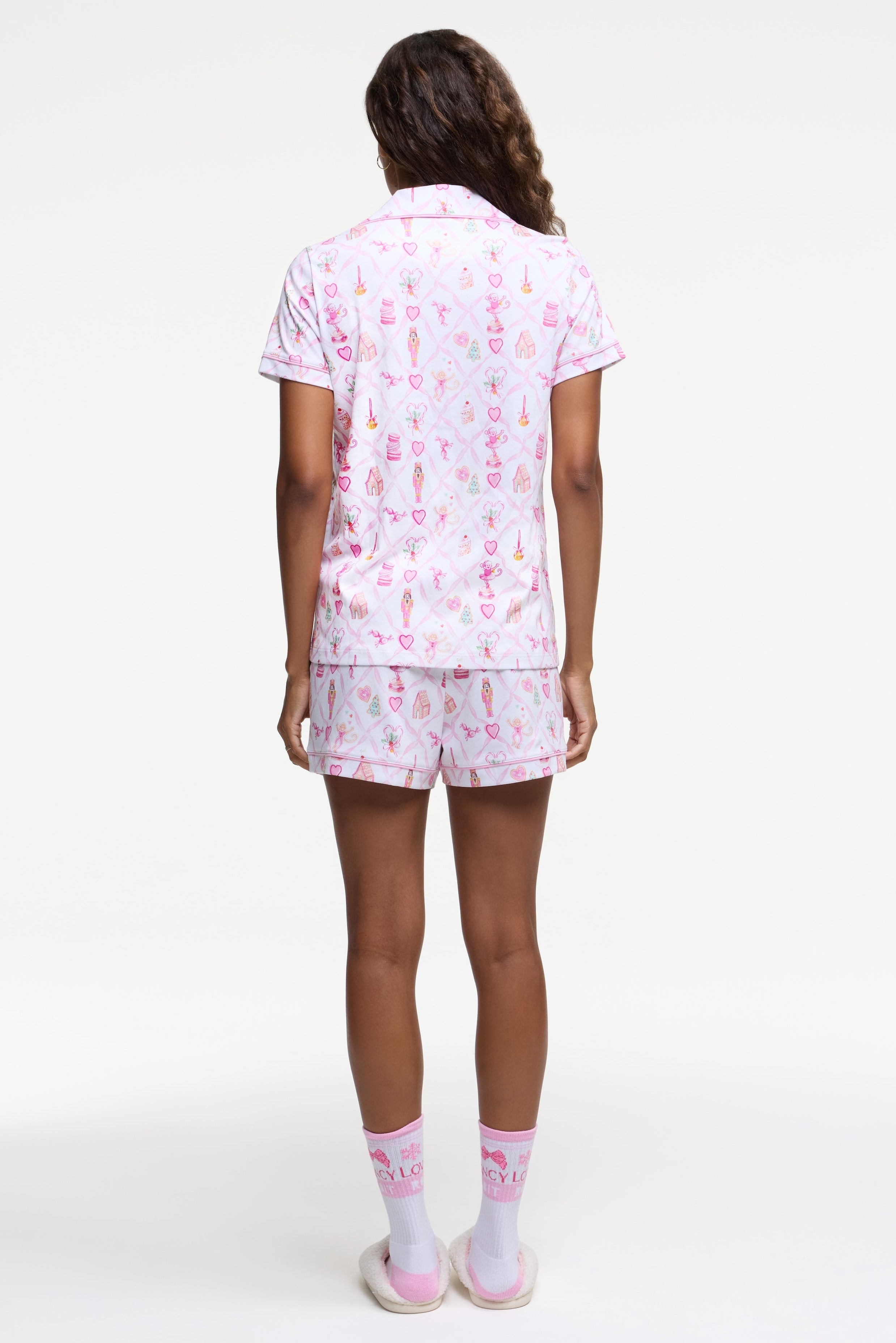 Deck the halls, trim the tree, or snuggle up on a cold winter's night in these festive shortie PJs, made with our signature satiny soft Pima interlock cotton and covered in the most magical pink print—a collaboration with our friends at LoveShackFancy.