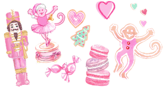 Sugarplum Lattice features gingerbread houses, candy canes, cookies, macaroons and all of our favorite Christmas sweets amongst a dreamy pink ribbon lattice.