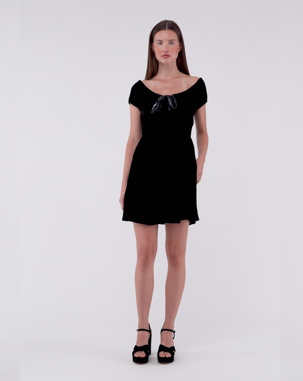 Give your LBD a wintry upgrade in the Tilly, a sweet and flirty velvet mini with swingy skirt ready for the dance floor and a deep V-neck enhanced with a cute floral bow.